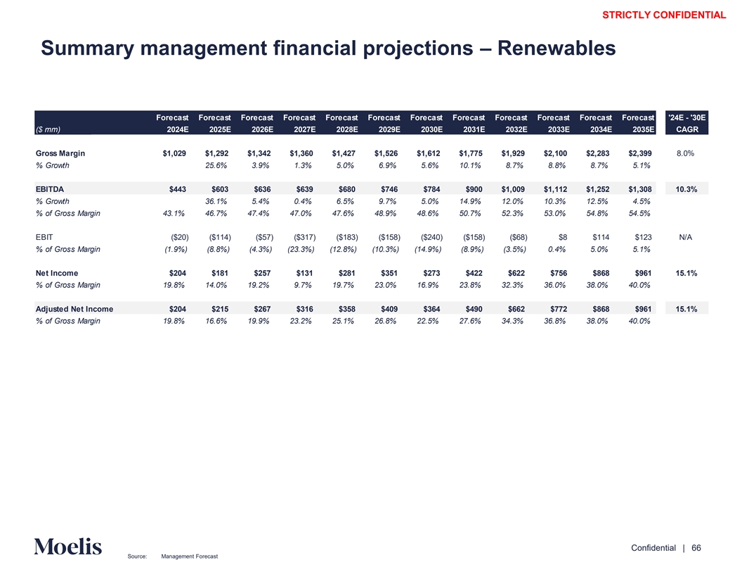严格保密的管理财务预测摘要–可再生能源预测预测预测预测预测预测预测预测预测预测预测预测预测预测预测‘24e-’30e($ mm)2024e2025e2026e2027e2028e2029e2030e2031e2032e2033e2034e2035eCAGR毛利率$ 1,029 $ 1,292 $ 1,342 $ 1,360 $ 1,427 $ 1,526 $ 1,612 $ 1,775 $ 1,929 $ 2,100 $ 2,283 $ 2,3998.0%增长25.6% 3.9% 1.3% 5.0% 6.9% 5.6% 10.1% 8.7% 8.8% 8.7% 5.1% EBITDA $ 443 $ 603 $ 636 $ 639 $ 680 $ 746 $ 784 $ 900 $ 1,009 $ 1,112 $ 1,252 $ 1,308 10.3%增长36.1% 5.4% 0.4% 6.5%47.0% 47.6% 48.9% 48.6% 50.7% 52.3% 53.0% 54.8% 54.5%息税前利润($ 20)($ 114)($ 57)($ 317)($ 183)($ 158)($ 240)($ 158)($ 68)$ 8 $ 114 $ 123不适用于毛利率(1.9%)(8.8%)(4.3%)(23.3%)(12.8%)(10.3%)(14.9%)(8.9%)(3.5%)0.4% 5.0% 5.1%净收益$ 204 $ 181 $ 257 $ 131 $ 281 $ 351 $ 273 $ 422 $ 622 $ 756 $ 868 $ 96115.1%毛利率19.8% 14.0% 19.2% 9.7% 19.7% 23.0% 16.9% 23.8% 32.3% 36.0% 38.0%36.8% 38.0% 40.0%含量不得低于此线机密| 66来源:管理层预测