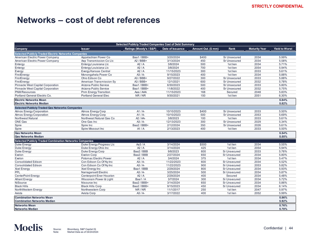 严格保密网络–债务成本参考精选公开交易公司债务成本摘要公司发行人评级(穆迪/标普)发行日期金额。($ mm)排名到期年收益率最差选定公开交易的电力网络公司美国电力公司Appalachian Power Co Baa1/BBB + 3/20/2024 $ 400 SR无担保20345.99% 美国电力公司AEP Transmission Co LLC A2/BBB + 3/13/2024450 SR无担保20345.58% 安特吉安特吉TERMLouisiana LLC A2/A3/8/2024500第1留置权20345.71% 安特吉TERM4安特吉TERMiana LLC A2/A3/8/2024700第1留置权20545.94% EvergyEvergyTERMKansas Central A2/A11/15/2023300第1FirstEnergy Ohio Edison Co A3/BBB + 9/27/2022300 SR未担保20335.88% FirstEnergy American Transmission SY A3/BBB + 12/1/2021600 SR未担保20325.78% 西帕纳卡资本公司 Arizona Public Service Baa1/BBB + 6/30/2023500 SR未担保20335.80%丨Pinnacle West Capital Corporation丨Arizona Public Service Baa1/BBB + 11/8/2022400 SR未担保20325.75% PNM电力瓦斯TERMnm Energy Transition AAA/AAA 11/15/2023168获得20485.83% 波特兰通用电气 Co. Portland General Elec NR/NR9/30/2021150 1st Lien 20516.30% Electric Networks mean 5.84Networks Companies ATMOS能源公司ATMOS能源 Corp A1/A-10/10/2023 $ 400 SR Unsecured 20335.50% ATMOS能源公司ATMOS能源 Corp A1/A-10/10/2023500 SR Unsecured 20535.69% 西北天然气TERM4西北天然气 Gas Co A2/AA-3/8/2023100 1st Lien 20335.61% ONE Gas One Gas Inc A3/A-12/13/2023300 SR Unsecured 20295.34% Spire Spire Inc Baa2/BBB + 2/12/2024350 SR Unsecured 20265.61% Spire Spire Missouri Inc A1/A2/13/2023400 1st Lien 20335.4公司杜克能源杜克能源 Progress LLC AA3/A3/14/2024 $ 500第1留置权20345.55% 杜克能源杜克能源TERM5 Corp Baa2/BBB 9/8/2023600 SR无抵押20335.76% 爱克斯龙爱克斯龙 Corp Baa2/BBB 2/27/2024650 SR无抵押20345.80% 爱克斯龙波托马克电力TERM9TERMA2/A3/4/2024375第1留置权20345.47% 爱迪生联合电气TERM10TERM10900 SR无抵押20535.82% 埃克西尔能源埃克西尔能源 Inc Baa1/BBB 2/29/2024800 SR无抵押20345.93% PPL Narragansett Electric A3/A-3/25/2024500 SR无抵押20345.87% CenterPoint Energy CenterPoint Ener Houston A2/A 2/29/2024400有抵押20345.48% 美国联合能源 Wisconsin Power & Light Baa1/A 3/7/2024300 SR无抵押20345.72% NiSource TERM0尼索斯 Inc Baa2/BBB + 3/14/2024650 SR无抵押20345.86% Black Hills Black Hills Corp Baa2/BBB + 9/15/2023450 SR无抵押20阿维斯塔 Corp A3/A-3/17/2022400第1留置权20525.99%组合网络均值5.86%组合网络中值5.92%网络均值5.76%网络中值5.78%内容不得低于此线机密| 44资料来源:彭博,标普 Capital IQ注:市场数据截至2024年4月24日