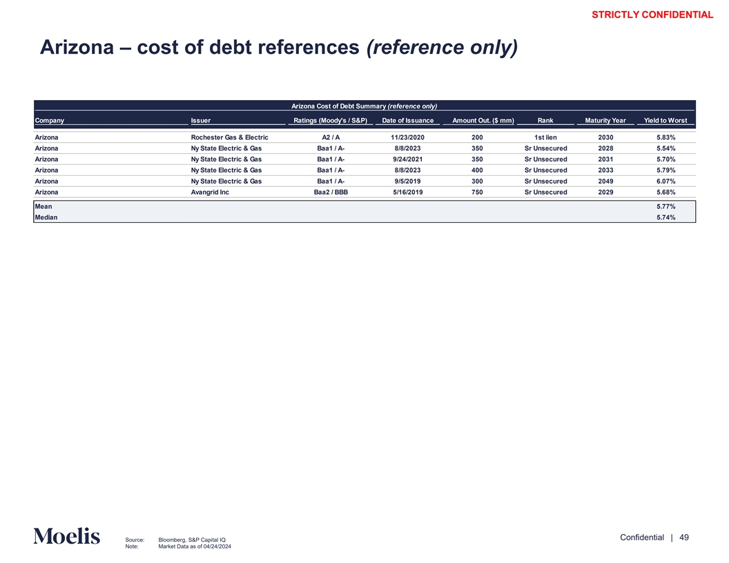 严格保密亚利桑那州–债务成本参考(仅供参考)亚利桑那州债务成本摘要(仅供参考)公司发行人评级(穆迪/标普)发行日期金额。($ mm)rank maturity year yield to worst Arizona Rochester Gas & Electric A2/A11/23/2020200 1st lien 20305.83% Arizona NY State Electric & Gas Baa1/A-8/8/2023350 Sr unsecured 20285.54% Arizona NY State Electric & Gas Baa1/A-9/24/2021350 Sr unsecured 20315.70% Arizona NY State Electric & Gas Baa1/A-8/8/2023400 Sr unsecured 20335.79% Arizona NY State Electric & Gas Baa1/A-9/5/2019300 Sr unsecured 20496.07% Arizona Avangrid Inc Baa2/BBB 5/16/不得低于此线机密| 49资料来源:彭博、标普 Capital iQ注:市场数据截至2024年4月24日