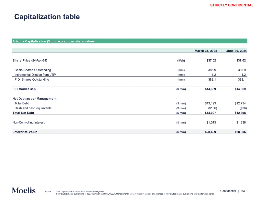 严格保密资本表Arizona Capitalization($ mm,每股价值除外)2024年3月31日2024年6月30日股价(24-Apr-24)($/SH)$ 37.02 $ 37.02基本流通股(mm)386.93 86.9从LTIP(mm)的增量稀释(1.2 1.2 F.D.流通股(mm)388.1388.1 F.D.市值。($ mm)$ 14,369 $ 14,369按管理层口径的净债务总债务($ mm)$ 13,193 $ 12,734现金及现金等价物($ mm)($ 166)($ 36)总净债务($ mm)$ 13,027 $ 12,698非控股权益($ mm)$ 1,013 $ 1,238企业价值($ mm)$ 28,409 $ 28,306内容不得低于此线机密| 63资料来源:截至2024年4月24日的标普 Capital IQ,Arizona Management 1。截至2024年3月31日已发行完全摊薄股份为3.88 146亿股,管理层预测不假设在预测期内已发行完全摊薄股份有任何变化