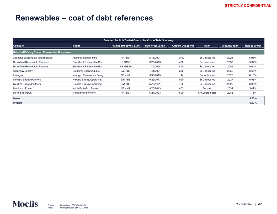 严格保密的可再生能源–债务成本参考精选公开交易公司债务成本摘要公司发行人评级(穆迪/标普)发行日期金额。($ mm)排名到期年收益率最差的选定公开交易的可再生能源公司亚特兰大持续基础设施 Atlantica Sustain Infra NR/BB + 5/18/2021 $ 400 SR无抵押20286.95%丨布鲁克菲尔德可再生丨布鲁克菲尔德可再生合作伙伴丨布鲁克菲尔德可再生丨布鲁克菲尔德可再生 Par NR/BBB + 3/29/2023400 SR无抵押20335.32%丨布鲁克菲尔德可再生布鲁克菲尔德可再生合作伙伴布鲁克菲尔德可再生TERM4 Par NR/BBB + 1/10/2024400 SR无抵押20545.64%丨Clearway Energy Clearway EnergyClearway EnergyTERM6 Op LLC BA2/BB 10/1/2021350 SR无抵押20326.63% Innergex Innergex Renewable Ener6.98% NextEra Energy Partners 新纪元能源 Operating Ba1/BB 12/15/2023750 SR Unsecured 20296.93% Northland Power North Battleford Power NR/NR9/20/2013463 Secured 20325.47% Northland Power Northland Power Inc NR/BB + 6/21/2023500 SR Subordinated 20837.76% Mean 6.65% Medium 6.93% Content must not go below this line confidential | 47 Source:Bloomberg,标普 Capital IQ注:市场数据截至04/24/2024