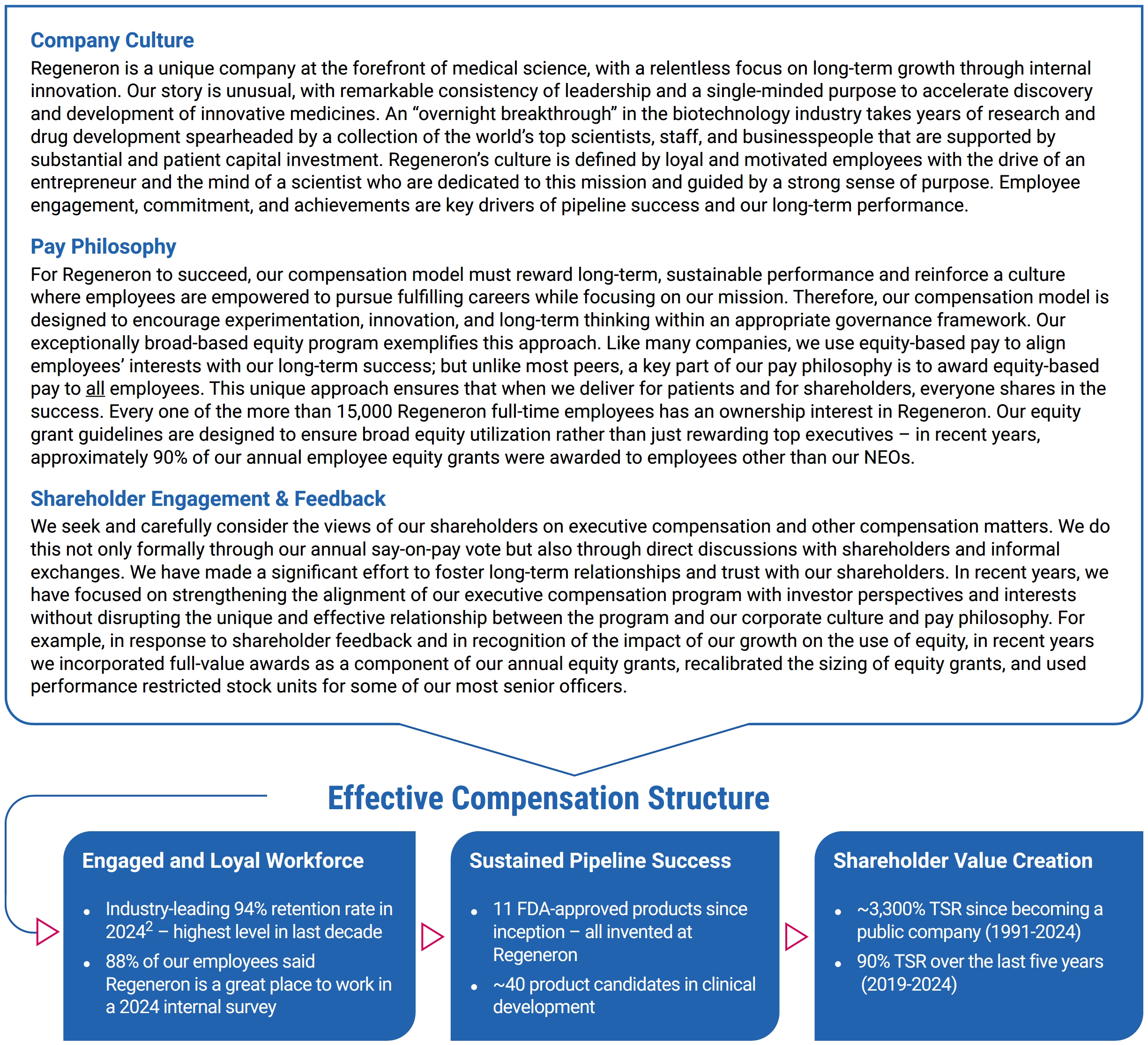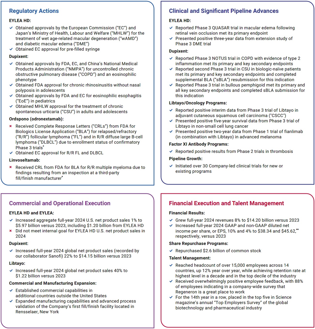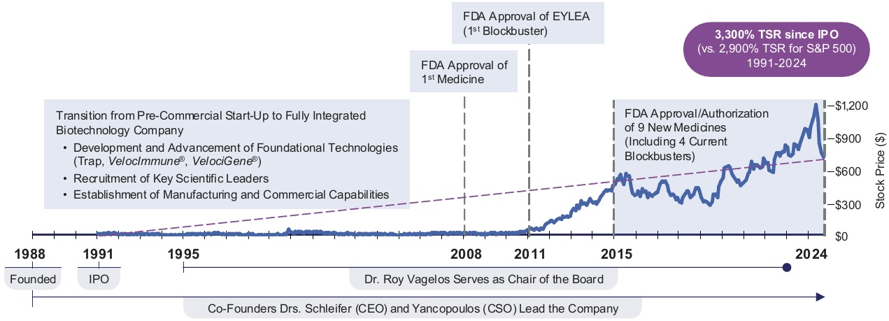 我们管道的实力,加上我们在战略上始终如一地执行的记录,为再生元制药的长期成功奠定了基础。我们的资金实力使我们能够投资于我们的研发(“研发”)管道,以支持未来的潜在增长。2024年,我们在研发方面投入了51亿美元,并拨出近7.56亿美元的资本支出,除其他外,用于扩大我们位于纽约州塔里敦的研发总部。我们在纽约伦斯勒建造了一个填充/完成制造工厂,该工厂正在按照监管机构的要求进行工艺验证,我们还在纽约州北部收购了一个工厂,该工厂有可能使我们能够进一步扩大我们的制造能力。2025年2月,我们公司历史上第一次董事会批准启动季度现金股息计划,反映了我们对业务持久性的长期信心。同样在2025年2月,我们将股票回购授权扩大了30亿美元,使我们在公告发布时的总回购能力达到45亿美元。重要的是,通过股票回购和股息向股东返还资本并不影响我们投资于我们的研发管道和业务的主要资本配置优先级。这种科学雄心和有纪律的资本配置的结合将使我们能够继续专注于为患者和股东提供长期价值。