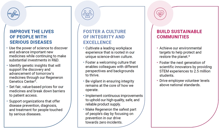 除了我们的药品,我们认真对待我们对社会的更广泛的责任。正如我们推动科学的边界一样,我们推动自己在最高水平的创新、诚信和对我们所服务的社区的深刻承诺下运作。我们为努力吸引和激励下一代伟大科学家而感到非常自豪,最引人注目的是支持了世界领先的高中科学竞赛,被称为再生元制药科学人才搜索和再生元制药国际科学与工程博览会,以及我们一起为改变而努力等相关项目TM在田纳西州纳什维尔的努力。