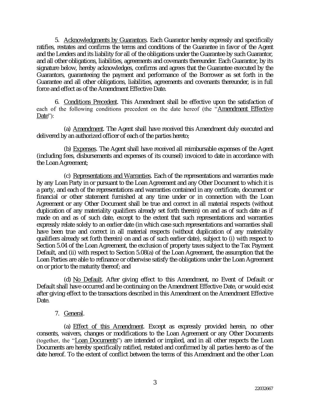5.担保人的确认。每个担保人在此明确和具体地批准、重述和确认有利于代理人和贷款人的担保条款和条件及其对该担保人在担保下的所有义务的责任,以及所有其他义务、责任、协议和其下的契约。每个担保人,通过其在下面的签名,特此承认、确认并同意担保人执行的担保,保证借款人在担保中的付款和履行以及所有其他义务、责任、协议和契约,自修订生效日期起完全有效。6.先决条件。本修订应在本修订日期(“修订生效日期”)满足以下各项先决条件后生效:(a)修订。代理人应已收到由授权人正式签署和交付的本修正案 本协议各方的官员;(b)费用。迄今为止,代理人应已收到根据贷款协议开具发票的代理人的所有可报销费用(包括其律师的费用、支出和开支);(c)陈述和保证。任何贷款方在贷款协议及其作为一方的任何其他文件中或根据贷款协议作出的每项陈述和保证,以及任何证书中包含的每项陈述和保证,根据贷款协议或任何其他文件或与贷款协议或任何其他文件有关的任何时间提供的文件或财务或其他声明在所有重大方面均应真实和正确(不得重复其中已规定的任何重要性限定词)如果在该日期和截至该日期作出,除非此类陈述和保证明确仅与较早的日期相关(在这种情况下,此类陈述和保证应为真实 并在所有重大方面进行更正(不重复其中已经规定的任何重要性限定词),截至该较早日期),受(i)关于贷款协议第5.04条的约束,不包括受以下条件约束的财产税纳税违约,关于贷款协议第5.08(a)条,假设贷款方能够在贷款协议到期日或之前再融资或以其他方式履行贷款协议项下的义务;(d)无违约。在本修订生效后,任何违约或违约事件均不会发生并在修订生效日期继续存在,或在本修订所述的交易在修订生效日期生效后将不存在。7.一般的。(a)本修正案的效力。除本协议明确规定外,对贷款协议或任何其他文件(统称为“贷款文件”)的任何其他同意、弃权、变更或修改均不属于 有意或暗示,以及在所有其他方面,贷款文件特此由所有各方在本协议签署之日特别批准、重述和确认。在本修正案的条款与其他贷款322032667之间的冲突范围内