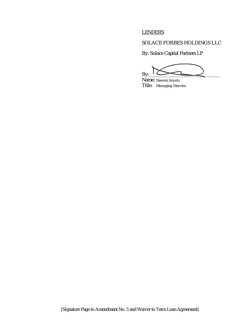 Lenders Solace Forbes Holdings LLC作者:Solace Capital Partners LP作者:__________________________姓名:Naeem Arastu职务:董事总经理[第5号修正案的签名页和定期贷款协议的豁免]