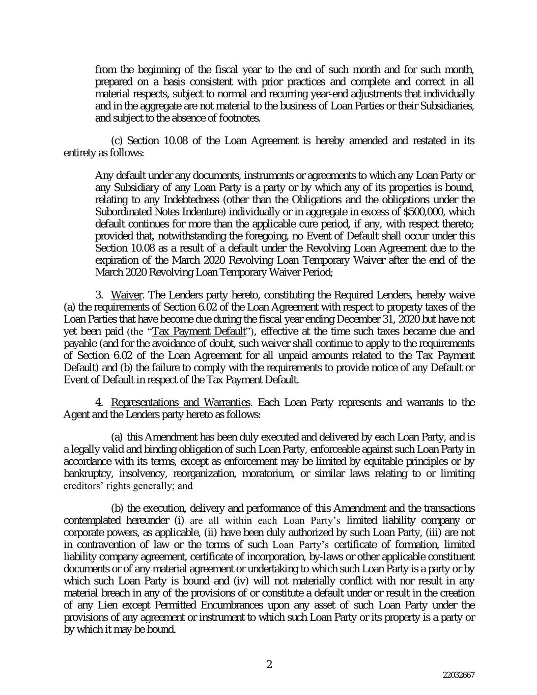 从财政年度开始到该月末和该月,在与以往惯例一致的基础上编制,并在所有重大方面完整和正确,受正常和经常性的年终调整的约束,这些调整单独和总体上对贷款方或其子公司的业务并不重要,并且没有脚注。(c)贷款协议第10.08条特此修订并全文重述如下:任何贷款方或任何贷款方的任何子公司作为一方或其任何附属公司的任何文件、文书或协议项下的任何违约属性被绑定,与单独或总计超过500,000美元的任何债务(债务和次级债券义齿项下的义务除外)有关,该违约持续超过适用的补救期(如果有);前提是,尽管有上述规定,没有违约事件 由于在2020年3月循环贷款临时豁免期结束后2020年3月循环贷款临时豁免期到期而导致循环贷款协议下的违约,应根据本第10.08条发生;3。放弃。本协议的贷款方,构成所需的贷款人,特此放弃(a)贷款协议第6.02节关于贷款方在截至12月31日的财政年度内到期的财产税的要求,2020年但尚未支付(“纳税违约”),在此类税款到期应付时生效(为免生疑问,此类豁免应继续适用于贷款协议第6.02节对与纳税违约相关的所有未付金额的要求)(b)未能遵守就纳税违约提供任何违约或违约事件通知的要求。4.陈述和保证。每个贷款方 向代理人和贷款方陈述和保证如下:(a)本修正案已由每一贷款方正式签署和交付,并且是该贷款方的一项具有法律效力和约束力的义务,可根据以下规定对该贷款方强制执行其条款,除非强制执行可能受到衡平原则或破产、资不抵债、重组、延期偿付或与一般限制债权人权利有关或限制的类似法律的限制;(b)执行,本修正案的交付和履行以及本协议项下拟进行的交易(i)均在每个贷款方的有限责任公司或公司权力范围内(如适用),已获得该贷款方的正式授权,不违反法律或该贷款方的成立证书、有限责任公司协议、公司注册证书、附则或其他适用的组成文件或任何重大协议或承诺的条款 该贷款方是其中一方或该贷款方受其约束不会与任何条款的任何规定发生重大冲突或导致任何重大违反,或构成违约或导致任何留置权的产生,但根据任何协议的规定对该贷款方的任何资产的允许产权负担除外或该贷款方或其财产作为一方或可能受其约束的文书。2 22032667
