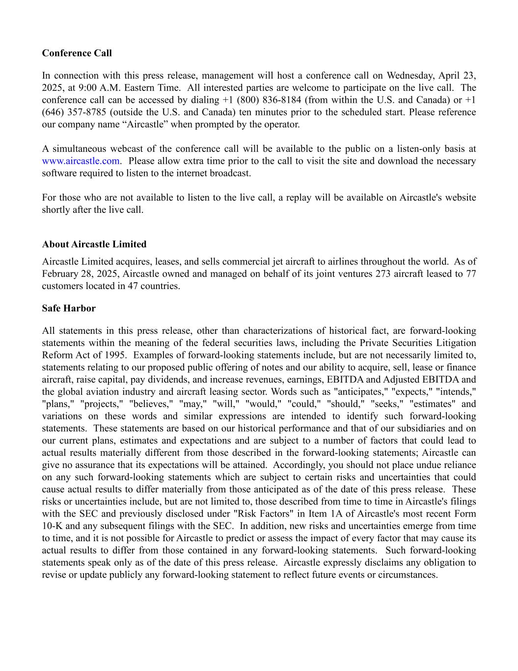 与本新闻稿相关的电话会议,管理层将于美国东部时间2025年4月23日(星期三)上午9点召开电话会议。欢迎有兴趣的各方参与直播电话。电话会议可在预定开始前十分钟拨打+ 1(800)836-8184(美国和加拿大境内)或+ 1(646)357-8785(美国和加拿大境外)进行。接线员提示请参考我司公司名称“爱卡索”。电话会议的同步网络广播将在www.aircastle.com上以仅供收听的方式向公众提供。请在通话前留出额外时间到现场参观,并下载收听网络广播所需的必要软件。对于那些无法收听实时通话的用户,将在实时通话结束后不久在爱卡索的网站上提供重播。关于Aircastle LimitedAircastle Limited向世界各地的航空公司收购、租赁和销售商用喷气式飞机。截至2025年2月28日,爱卡索代表其合资企业拥有和管理出租给位于47个国家的77家客户的273架飞机。安全港本新闻稿中的所有陈述,除了对历史事实的描述外,都是联邦证券法含义内的前瞻性陈述,包括1995年的《私人证券诉讼改革法案》。前瞻性陈述的例子包括但不一定限于与我们提议的公开发行票据以及我们获得、出售、租赁或融资飞机、筹集资本、支付股息以及增加收入、收益、EBITDA和调整后EBITDA以及全球航空业和飞机租赁部门的能力有关的陈述。诸如“预期”、“预期”、“打算”、“计划”、“项目”、“相信”、“可能”、“将”、“将”、“可能”、“应该”、“寻求”、“估计”等词语以及这些词语和类似表述的变体旨在识别此类前瞻性陈述。这些陈述是基于我们和我们子公司的历史业绩以及我们目前的计划、估计和预期,并受到可能导致实际结果与前瞻性陈述中描述的结果大不相同的许多因素的影响;爱卡索无法保证其预期将会实现。因此,您不应过分依赖任何此类前瞻性陈述,这些陈述受到某些风险和不确定性的影响,可能导致实际结果与截至本新闻稿发布之日的预期结果存在重大差异。这些风险或不确定性包括但不限于爱卡索向SEC提交的文件中不时描述的以及此前在爱卡索最近的10-K表格以及随后向SEC提交的任何文件的第1A项以及在“风险因素”项下披露的风险或不确定性。此外,新的风险和不确定性不时出现,并且爱卡索无法预测或评估可能导致其实际结果与任何前瞻性陈述中包含的结果不同的每一个因素的影响。此类前瞻性陈述仅在本新闻稿发布之日发表。爱卡索明确表示不承担任何义务公开修改或更新任何前瞻性陈述以反映未来事件或情况。