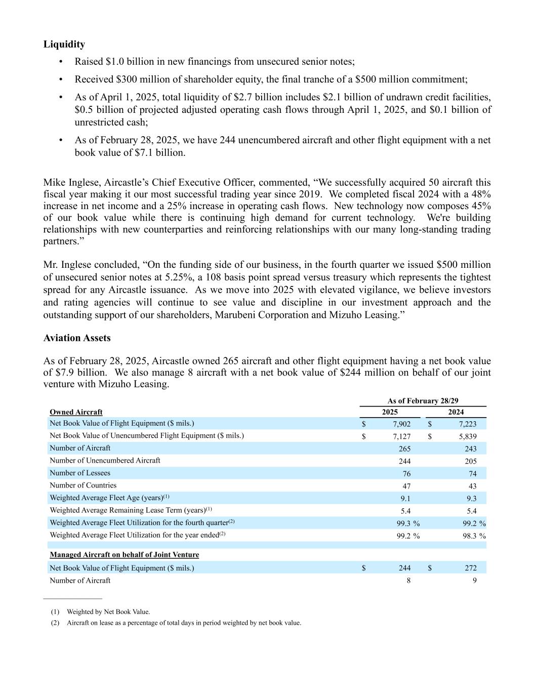 流动性•从无担保优先票据中筹集了10亿美元的新融资;•收到3亿美元的股东权益,这是5亿美元承诺的最后一笔;•截至2025年4月1日,27亿美元的总流动性包括21亿美元的未提取信贷额度、截至2025年4月1日的预计调整后经营现金流5亿美元,以及1亿美元的非限制性现金;•截至2025年2月28日,我们有244架未支配的飞机和其他飞行设备,账面净值为71亿美元。爱卡索的首席执行官Mike Inglese评论说:“本财年我们成功地购买了50架飞机,使其成为自2019年以来我们最成功的交易年。我们完成了2024财年,净收入增长了48%,经营现金流增长了25%。新技术现在占我们账面价值的45%,同时对当前技术的需求持续高涨。我们正在与新的交易对手建立关系,并加强与我们许多长期存在的贸易伙伴的关系。”Inglese先生总结道:“在我们业务的资金方面,第四季度我们以5.25%的利率发行了5亿美元的无担保优先票据,与美国国债的利差为108个基点,这是所有爱卡索发行中利差最窄的。随着我们以更高的警惕性进入2025年,我们相信投资者和评级机构将继续看到我们的投资方法的价值和纪律,以及我们的股东丸红株式会社和瑞穗租赁的出色支持。”航空资产截至2025年2月28日,爱卡索拥有265架飞机和其他飞行设备,账面净值为79亿美元。我们还代表我们与瑞穗租赁的合资企业管理8架飞机,账面净值为2.44亿美元。截至2月28日/29日自有飞机20252024飞行设备账面净值(百万美元)$ 7,902 $ 7,223未支配飞行设备账面净值(百万美元)$ 7,127 $ 5,839飞机数量265243未支配飞机数量244205承租人数量7674国家数量4743加权平均机队年龄(年)(1)9.19.3加权平均剩余租赁期限(年)(1)5.45.4第四季度加权平均机队利用率(2)99.3% 99.2%加权平均机队利用率截至(2)年度99.2% 98.3%代合营公司管理飞机飞行设备账面净值(百万美元)$ 244 $ 272飞机数量89______________(1)按账面净值加权。(2)按账面净值加权的租赁飞机占期间总天数的百分比。