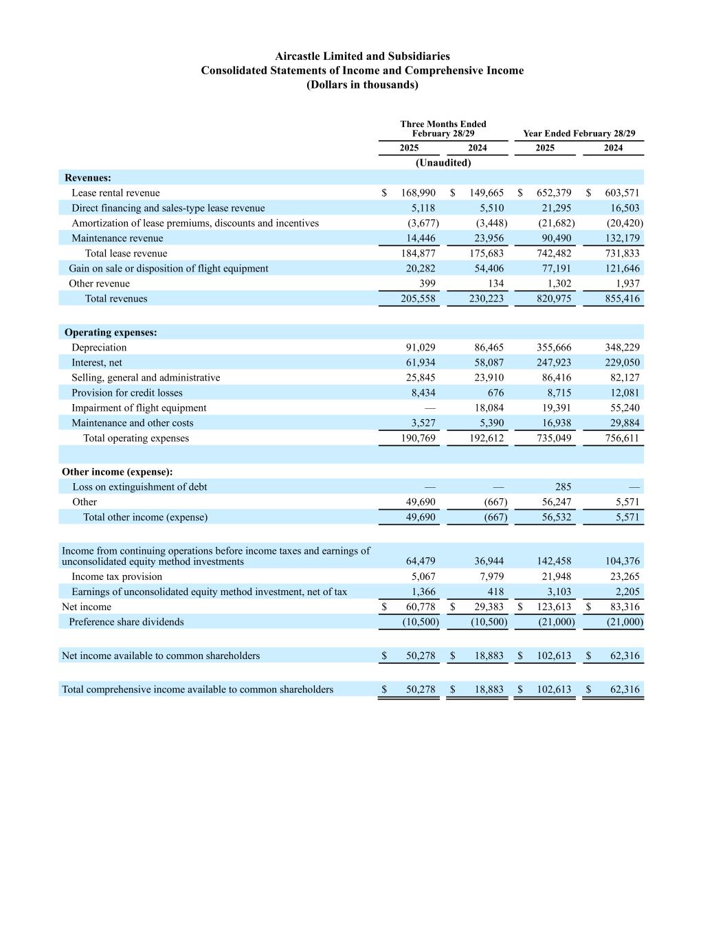 Aircastle Limited及附属公司综合收益表及综合收益表(单位:千美元)截至2月28/29止三个月截至2月28/29止年度2025202420252024(未经审计)收入:租赁租金收入168,990美元149,665美元652,379美元603,571美元直接融资和销售型租赁收入5,1185,51021,29516,503租赁溢价摊销,折扣和奖励(3,677)(3,448)(21,682)(20,420)维修收入14,44623,95690,490132,179总租赁收入184,877175,683742,482731,833出售或处置飞行设备收益20,28254,40677,191121,646其他收入3991341,3021,937总收入205,558230,223820,975855,416营业费用:折旧91,02986,465355,666348,229利息,净额61,93458,087247,923229,050销售,一般和行政25,84523,91086,41682,127信用损失准备8,4346768,71512,081飞行设备减值— 18,08419,39155,240维修和其他费用3,5275,39016,93829,884营业费用总额190,769192,612735,049756,611其他收入(费用):债务清偿损失—— 285 —其他49,690(667)56,2475,571其他收入(费用)总额49,690(667)56,5325,571所得税前持续经营收入和未合并权益法投资收益64,47936,944142,458104,376所得税准备5,0677,97921,94823,265未合并权益法投资收益,税后净额1,3664183,1032,205净收益$ 60,778 $ 29,383 $ 123,613 $ 83,316优先股股息(10,500)(10,500)(21,000)(21,000)普通股股东可得净收益$ 50,278 $ 18,883 $ 102,613 $ 62,316普通股股东可得综合收益总额$ 50,278 $ 18,883 $ 102,613 $ 62,316