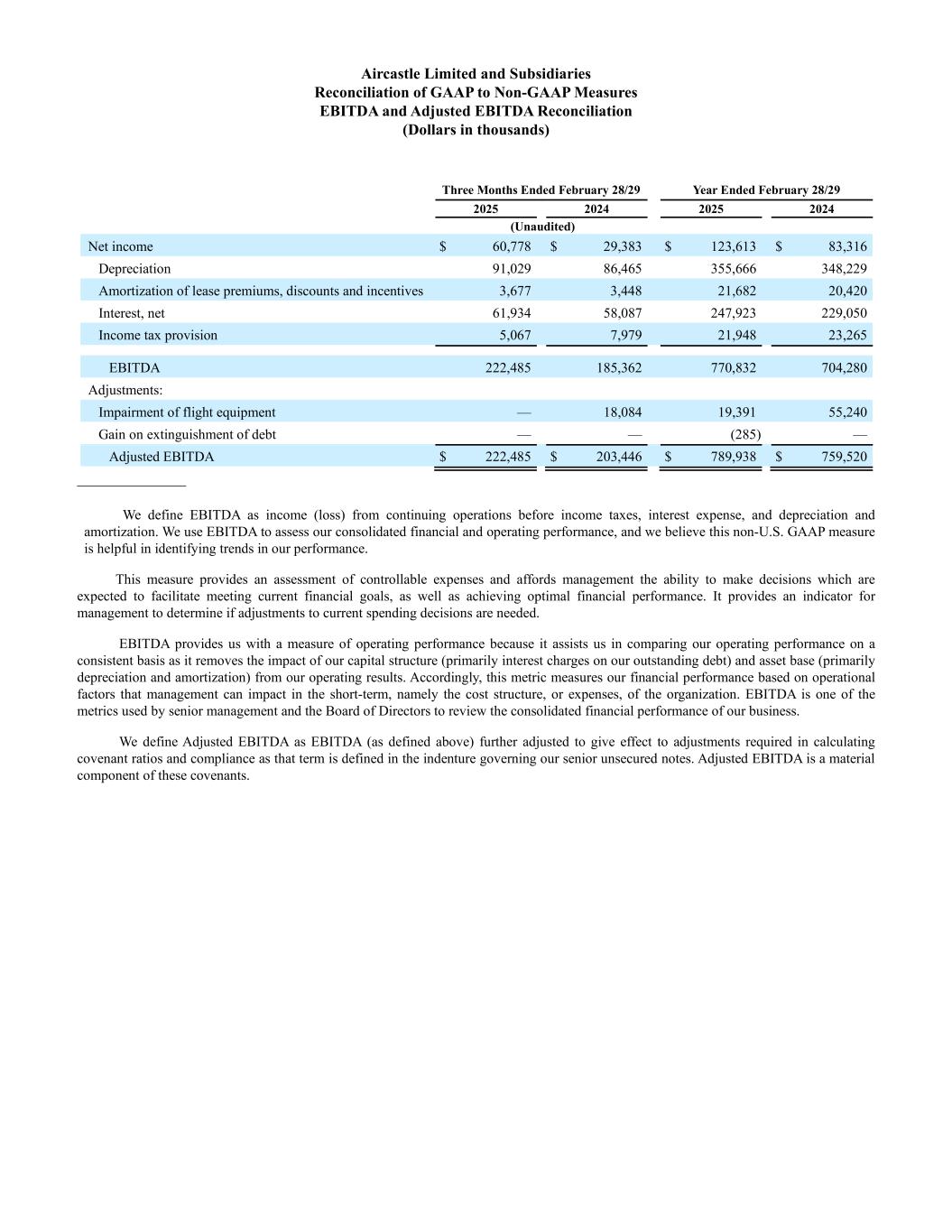 Aircastle Limited和子公司GAAP与非GAAP指标的对账EBITDA和调整后EBITDA对账(单位:千美元)截至2月28/29的三个月截至2月28/29的年度2025202420252024(未经审计)净收入60,778美元29,383美元123,613美元83,316美元折旧91,02986,465355,66348,229租赁溢价、折扣和奖励摊销3,6773,44821,68220,420利息,净额61,93458,087247,923229,050所得税拨备5,0677,97921,94823,265 EBITDA 222,485 185,362770,832704,280调整:飞行设备减值— 18,08419,39155,240债务清偿收益——(285)—调整后EBITDA 222,485美元203,446美元789,938美元759,520美元__________我们将EBITDA定义为所得税、利息费用以及折旧和摊销前的持续经营收入(亏损)。我们使用EBITDA来评估我们的综合财务和经营业绩,我们认为这一非美国公认会计原则衡量标准有助于确定我们业绩的趋势。该措施提供了对可控费用的评估,并为管理层提供了做出预期有助于实现当前财务目标的决策的能力,以及实现最佳财务绩效的能力。它为管理层提供了一个指标,以确定是否需要对当前的支出决策进行调整。EBITDA为我们提供了经营业绩的衡量标准,因为它有助于我们在一致的基础上比较我们的经营业绩,因为它从我们的经营业绩中消除了我们的资本结构(主要是未偿债务的利息费用)和资产基础(主要是折旧和摊销)的影响。因此,该指标根据管理层可以在短期内影响的运营因素,即组织的成本结构或费用,来衡量我们的财务业绩。EBITDA是高级管理层和董事会用来审查我们业务的综合财务业绩的指标之一。我们将调整后EBITDA定义为进一步调整的EBITDA(如上定义),以实现计算契约比率和合规性所需的调整,因为该术语在管理我们的高级无抵押票据的契约中定义。调整后的EBITDA是这些契约的重要组成部分。