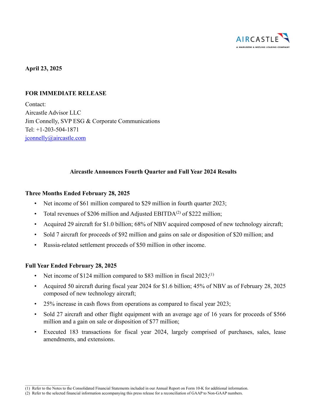 ______________________(1)有关更多信息,请参阅我们的10-K表格年度报告中包含的合并财务报表附注。(2)有关GAAP与非GAAP数字的对账,请参阅本新闻稿随附的选定财务信息。立即发布联系人:爱卡索 Advisor LLC Jim Connelly,ESG和企业传播高级副总裁电话:+ 1-203-504-1871 jconnelly@aircastle.com 爱卡索公布截至2月28日的三个月2024年第四季度和全年业绩,2025年•净收入6100万美元,2023年第四季度为2900万美元;•总收入2.06亿美元,调整后EBITDA(2)为2.22亿美元;•以10亿美元收购29架飞机;收购的NBV的68%由新技术飞机组成;•出售7架飞机,收益为9200万美元,出售或处置收益为2000万美元;•与俄罗斯有关的和解收益为5000万美元的其他收入。截至2025年2月28日的全年•净收入为1.24亿美元,而2023财年为8300万美元;(1)• 2024财年期间以16亿美元的价格购买了50架飞机;截至2025年2月28日,新技术飞机构成的新业务价值的45%;•与2023财年相比,运营现金流增加25%;•出售了27架平均机龄为16年的飞机和其他飞行设备,收益为5.66亿美元,出售或处置收益为7700万美元;• 2024财年执行了183笔交易,主要包括购买、出售、租约修订和延期。