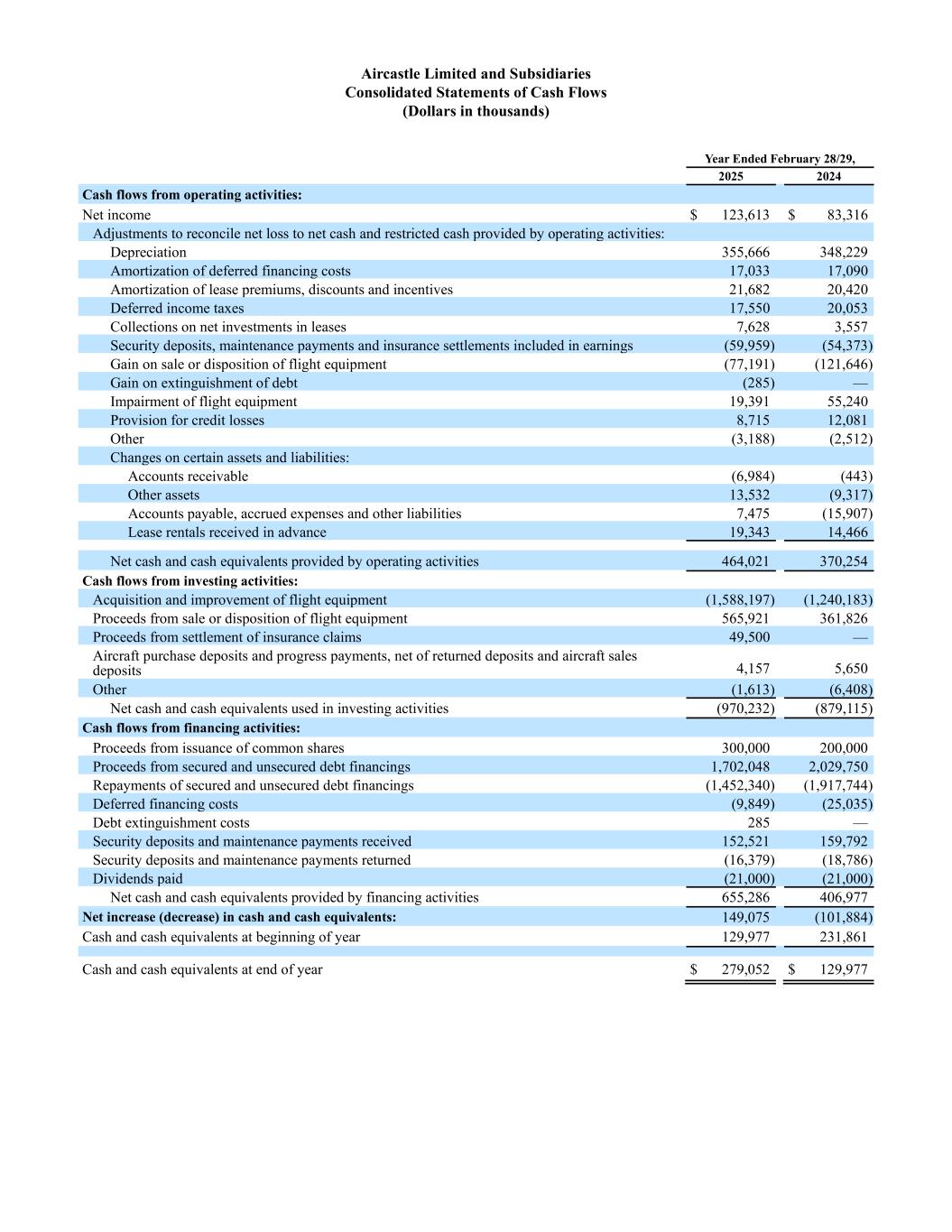 Aircastle Limited和子公司合并现金流量表(单位:千美元)截至2025年2月28日/29日的年度2024年经营活动现金流量:净收入123,613美元83,316美元调整净亏损与经营活动提供的净现金和受限现金:折旧355,666348,229递延融资成本摊销17,03317,090租赁溢价、折扣和奖励摊销21,68220,420递延所得税17,55020,053租赁净投资的收款7,6283,557保证金,计入收益的维修款和保险结算(59,959)(54,373)出售或处置飞行设备收益(77,191)(121,646)债务清偿收益(285)—飞行设备减值19,39155,240信用损失准备8,71512,081其他(3,188)(2,512)若干资产和负债变动:应收账款(6,984)(443)其他资产13,532(9,317)应付账款,应计费用及其他负债7,475(15,907)预收租赁租金19,34314,466经营活动提供的现金及现金等价物净额464,021370,254投资活动产生的现金流量:购置及改进飞行设备(1,588,197)(1,240,183)出售或处置飞行设备收益565,921361,826保险理赔收益49,500 —飞机购置定金及进度款,扣除退回的按金及飞机销售按金4,1575,650其他(1,613)(6,408)投资活动所用现金及现金等价物净额(970,232)(879,115)筹资活动产生的现金流量:发行普通股所得款项300,000200000有担保及无担保债务融资所得款项1,702,0482,029,750偿还有担保及无担保债务融资(1,452,340)(1,917,744)递延融资成本(9,849)(25,035)债务清偿成本285 —收到的保证金及维持款152,521159,792已退回的保证金及维持款(16,379)(18,786)支付的股利(21,000)(21,000)现金净额筹资活动提供的现金及等价物655,286406,977现金及现金等价物净增加(减少):149,075(101,884)年初现金及现金等价物129,977231,861年末现金及现金等价物279,052美元129,977