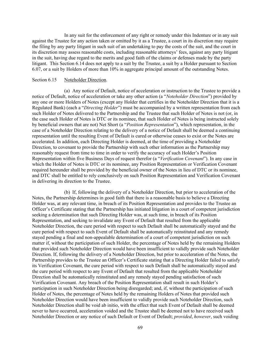 69在任何强制执行本契约项下任何权利或补救措施的诉讼中,或在针对受托人就其作为受托人所采取或不采取的任何行动提起的任何诉讼中,法院可酌情要求该诉讼中的任何一方诉讼当事人提出支付诉讼费用的承诺,而法院可酌情评估针对诉讼中任何一方诉讼当事人的合理费用,包括合理的律师费,同时适当考虑一方诉讼当事人提出的索赔或抗辩的是非曲直和善意。本条第6.14条不适用于受托人提出的诉讼、持有人根据第6.07条提出的诉讼或持有人提出的未偿还票据本金总额超过10%的诉讼。第6.15节票据持有人指示。(a)任何一名或多于一名票据持有人(但在票据持有人指示中证明其为受监管银行的任何持有人除外)(每个“指示持有人”)提供的任何违约通知、加速通知或指示受托人提供违约通知、加速通知或采取任何其他行动(“票据持有人指示”),必须附有每名该等票据持有人交付给合伙企业和受托人的书面陈述,表明该票据持有人不是(或者,在该票据持有人是DTC或其代名人的情况下,该票据持有人仅由非)净空头(“头寸表示”)的受益所有人指示,在票据持有人指示有关交付违约通知的情况下,该表示应被视为持续表示,直到由此产生的违约事件得到纠正或以其他方式不复存在或票据加速存在。此外,在提供票据持有人指示时,每个指示持有人被视为承诺向合伙企业提供合伙企业可能不时合理要求的其他信息,以便在提出要求后的五个工作日内验证该持有人的头寸陈述的准确性(“验证契约”)。在任何情况下,票据持有人为DTC或其代名人,则票据的实益拥有人应提供本协议所要求的任何职位代表或核实契约,以代替DTC或其代名人,而DTC有权在向受托人交付其指示时最终依赖该职位代表和核实契约。(b)如果在票据持有人指示交付后,但在票据加速发行之前,合伙企业善意地确定有合理依据认为指示持有人在任何相关时间违反了其头寸代表,并向受托人提供了一份高级人员证书,其中说明该合伙企业已在有管辖权的法院提起诉讼,寻求确定该指示持有人当时违反了其头寸代表,并寻求使适用的票据持有人指示导致的任何违约事件无效,与该违约有关的补救期应自动中止,与该违约事件有关的补救期应自动恢复,任何补救措施应在有管辖权的法院就该事项作出最终且不可上诉的裁定之前中止,如果没有该持有人的参与,提供该票据持有人指示的其余持有人持有的票据百分比将不足以有效提供该票据持有人指示。如果在票据持有人指示交付后,但在票据加速执行之前,合伙企业向受托人提供了一份高级人员证书,其中说明指示持有人未能满足其核查盟约,则与此种违约有关的补救期应自动中止,而与适用的票据持有人指示导致的任何违约事件有关的补救期应自动重新启动,任何补救措施应在满足该核查盟约之前中止。任何违反持仓代表的行为将导致该持有人参与该票据持有人指示的行为被置之不理;并且,如果没有该票据持有人的参与,其余票据持有人持有的票据百分比如果提供该票据持有人指示将不足以有效提供该票据持有人指示,则该票据持有人指示应从一开始就无效,大意是应将该违约事件视为从未发生,加速作废,受托人应被视为未收到该票据持有人指示或任何有关该违约或违约事件的通知;但前提是该作废