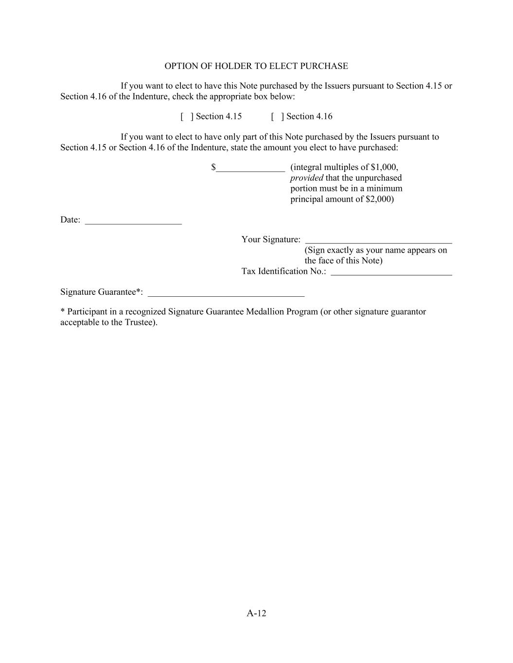 A-12持有人选择购买的选项如果您希望让发行人根据义齿第4.15节或第4.16节购买本票据,请选中下面的相应框:[ ]第4.15节[ ]第4.16节如果您希望让发行人根据义齿第4.15节或第4.16节仅购买本票据的一部分,请说明您选择购买的金额:$ ______________(1000美元的整数倍,前提是未购买部分的最低本金金额必须为2000美元)日期:______________________您的签名:(完全按照您的名字出现在本说明的正面签名)税号识别:签名保证*: __________________________________*参与经认可的签名保证奖章计划(或受托人可接受的其他签名担保人)。