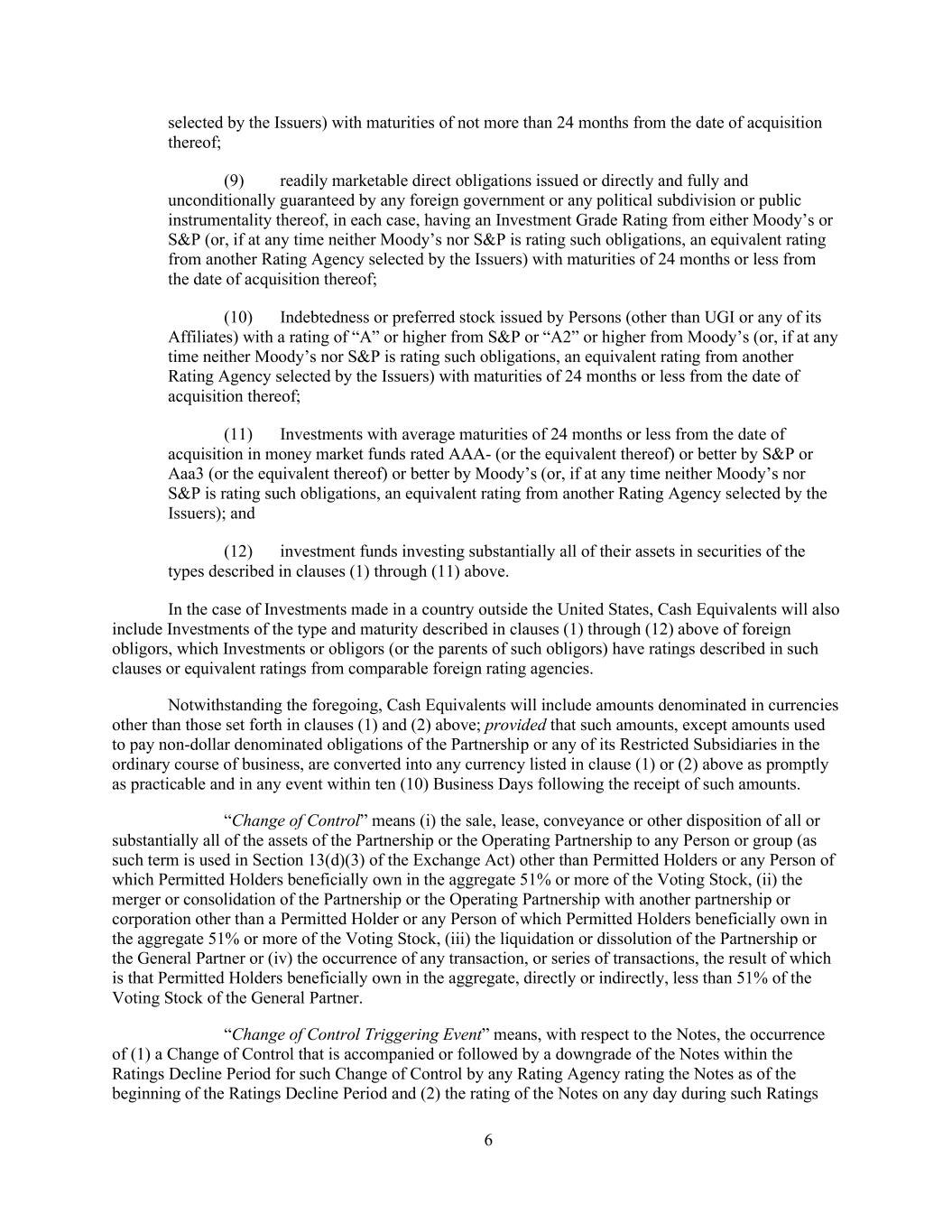 由发行人选择的6项),自获得之日起到期日不超过24个月;(9)由任何外国政府或其任何政治分支机构或公共工具发行或直接、全面和无条件担保的易于销售的直接义务,在每种情况下,具有穆迪或标普的投资级评级(或者,如果穆迪和标普在任何时候都不对此类义务进行评级,发行人选择的其他评级机构给予的同等评级),且期限为自收购之日起24个月或更短;(10)获标普“A”级或更高评级或获穆迪“A2”级或更高评级的人士(UGI或其任何关联公司除外)发行的债务或优先股(或者,如果在任何时候穆迪或标普均未对此类义务进行评级,自发行人选择的其他评级机构给予的同等评级),且其期限为自购买之日起24个月或以下;(11)自购买之日起平均期限为24个月或以下的投资于被标普或穆迪评为AAA-(或相当于其)或AAA3(或相当于其)或更高评级的货币市场基金(或者,如果在任何时候穆迪或标普均不对此类义务进行评级,发行人选定的其他评级机构的同等评级);(12)投资基金将其几乎全部资产投资于上文第(1)至(11)条所述类型的证券。就在美国以外的国家进行的投资而言,现金等价物还将包括外国承付人上文第(1)至(12)条所述类型和期限的投资,这些投资或承付人(或此类承付人的父母)具有此类条款所述的评级或可比外国评级机构的同等评级。尽管有上述规定,现金等价物将包括以上文第(1)和(2)条所列货币以外的货币计值的金额;但该等金额(在正常业务过程中用于支付合伙企业或其任何受限制子公司的非美元计价债务的金额除外)须在切实可行的范围内尽快转换为上文第(1)或(2)条所列的任何货币,无论如何在收到该等金额后十(10)个营业日内。“控制权变更”是指(i)将合伙企业或经营合伙企业的全部或几乎全部资产出售、出租、转让或以其他方式处置给任何个人或集团(如《交易法》第13(d)(3)条中使用的术语),但许可持有人或许可持有人实益拥有合计51%或以上有表决权股票的任何人除外,(ii)合伙企业或经营合伙企业与另一合伙企业或公司合并或合并,而非许可持有人或任何获许可持有人实益拥有合计51%或以上有表决权股份的人,(iii)合伙企业或普通合伙人的清算或解散,或(iv)发生任何交易或一系列交易,其结果是许可持有人直接或间接实益拥有合计不到51%的普通合伙人有表决权股份。“控制权变更触发事件”是指,就票据而言,发生(1)控制权变更,并伴随或随后在评级下降期内由任何评级机构在评级下降期开始时对票据进行此类控制权变更的评级下调,以及(2)在此类评级期间的任何一天对票据的评级