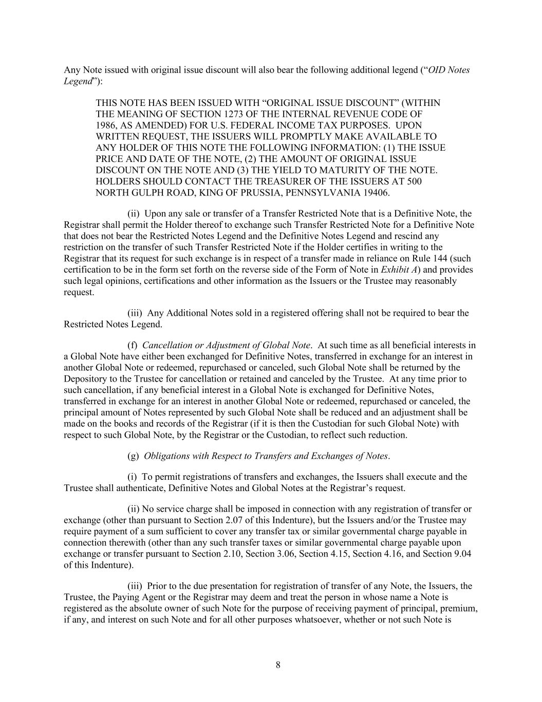 8任何以原始发行折扣发行的票据还将带有以下附加图例(“OID Notes Legend”):本票据已发行“原始发行折扣”(经修订的1986年《内部收入法典》第1273条的含义内),用于美国联邦所得税目的。发行人应书面请求,将迅速向本票据的任何持有人提供以下信息:(1)票据的发行价格和日期,(2)票据上的原始发行折扣金额和(3)票据的到期收益率。持有人应与发行人的财务主管联系,地址为500 North GULPH Road,King of Prussia,PENNSYLVANIA 19406。(ii)在任何出售或转让作为确定票据的转让受限制票据时,注册处处长须准许其持有人将该等转让受限制票据交换为不载有受限制票据传奇及最终票据传奇的最终票据,并解除对该等转让受限制票据的转让的任何限制,倘该持有人以书面向注册处处长证明其有关该等交换的请求是就根据第144条作出的转让(该等证明须采用附件 A中票据表格反面所列的格式)并提供该等法律意见,发行人或受托人可能合理要求的证明和其他信息。(iii)在注册发售中出售的任何额外票据,无须承担受限制票据图例。(f)取消或调整全球票据。当全球票据的所有实益权益已被交换为确定票据、转让以换取另一全球票据的权益或已赎回、回购或注销时,该全球票据应由存托人退回受托人注销或由受托人保留并注销。在注销前的任何时间,如全球票据的任何实益权益被交换为确定票据、转让以换取另一全球票据的权益或被赎回、回购或注销,则该全球票据所代表的票据本金金额应减少,并应由书记官长或托管人就该全球票据对书记官长(如果当时是该全球票据的托管人)的簿册和记录作出调整,以反映该减少。(g)票据转让和交换方面的义务。(i)为允许转让和交换的登记,发行人应在书记官长的要求下执行和受托人应认证、确定票据和全球票据。(ii)不得就任何转让或交换登记征收服务费(依据本契约第2.07条除外),但发行人和/或受托人可要求支付一笔足以支付任何转让税或与此有关的应支付的类似政府押记的款项(依据本契约第2.10条、第3.06条、第4.15条、第4.16条和第9.04条在交换或转让时应支付的任何此类转让税或类似政府押记除外)。(iii)在任何票据的转让登记的适当呈交前,发行人、受托人、付款代理人或注册官可将票据以其名义注册的人视为并视为该票据的绝对拥有人,以收取该票据的本金、溢价(如有的话)及利息的付款,以及为所有其他目的,不论该票据是否