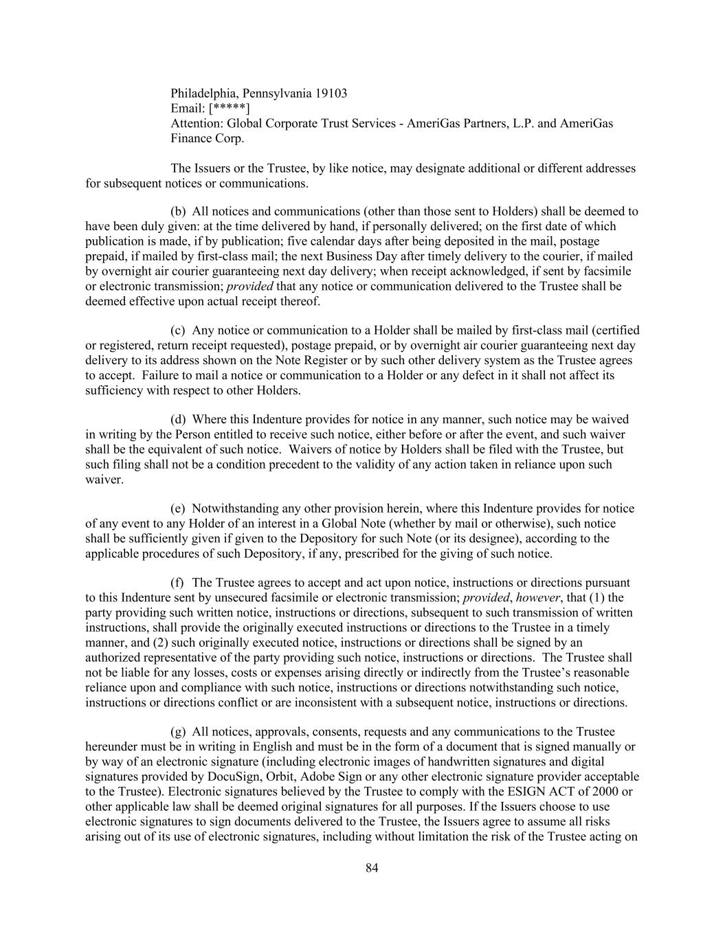 84宾夕法尼亚州费城19103邮箱:[*****】注意:Global Corporate Trust Services-AmeriGas Partners,L.P.和AmeriGas Finance Corp.发行人或受托人可通过类似通知,为后续通知或通信指定额外或不同的地址。(b)所有通知和通信(寄给持有人的通知和通信除外)均应被视为已妥为发出:在以专人送达的时间,如亲自送达;在公布的第一个日期,如以公布方式;在寄存邮件后五个日历日内,预付邮资,如以头等邮件邮寄;在及时送达快递员后的下一个营业日,如以保证次日送达的隔夜航空快递邮寄;在收货确认时,以传真或电子传送方式发送的;但交付给受托人的任何通知或通信应在实际收到时视为生效。(c)向持有人发出的任何通知或通讯,须以头等邮件(经核证或挂号、要求回执)、预付邮资、或以保证翌日送达其在记事簿上显示的地址的隔夜航空快递或由受托人同意接受的其他投递系统邮寄。未向持有人邮寄通知或通信或其中的任何缺陷,不影响其相对于其他持有人的充分性。(d)凡本指引以任何方式订定通知,则该通知可由有权收取该通知的人在该事件发生之前或之后以书面放弃,而该放弃相当于该通知。持有人对通知的放弃应向受托人提出,但该提交不应成为依赖该放弃而采取的任何行动有效性的先决条件。(e)尽管本条另有规定,凡本指引规定向全球票据权益的任何持有人(不论以邮寄或其他方式)发出任何事件的通知,如就该票据向保管人(或其指定人)发出该通知,则该通知须按照该保管人(如有的话)为发出该通知而订明的适用程序予以充分发出。(f)受托人同意接受依据本义齿以无担保传真或电子传送方式发出的通知、指示或指示,并根据这些通知、指示或指示行事;但条件是(1)提供该等书面通知、指示或指示的一方在该等书面指示传送后,须及时向受托人提供原已执行的指示或指示,及(2)该等原已执行的通知、指示或指示须由提供该等通知、指示或指示的一方的授权代表签署。受托人不对因受托人合理依赖和遵守该通知、指示或指示而直接或间接产生的任何损失、费用或开支承担责任,尽管该通知、指示或指示与随后的通知、指示或指示相冲突或不一致。(g)根据本协议向受托人发出的所有通知、批准、同意、请求和任何通信必须采用英文书面形式,并且必须采用手工签署或通过电子签字方式签署的文件形式(包括由DocuSign、Orbit、Adobe Sign或受托人可接受的任何其他电子签字提供者提供的手写签字和数字签字的电子图像)。被受托人认为符合2000年ESIGN法案或其他适用法律的电子签名应被视为所有目的的原始签名。发行人选择使用电子签字签署交付给受托人的文件的,发行人同意承担因其使用电子签字而产生的一切风险,包括但不限于受托人根据
