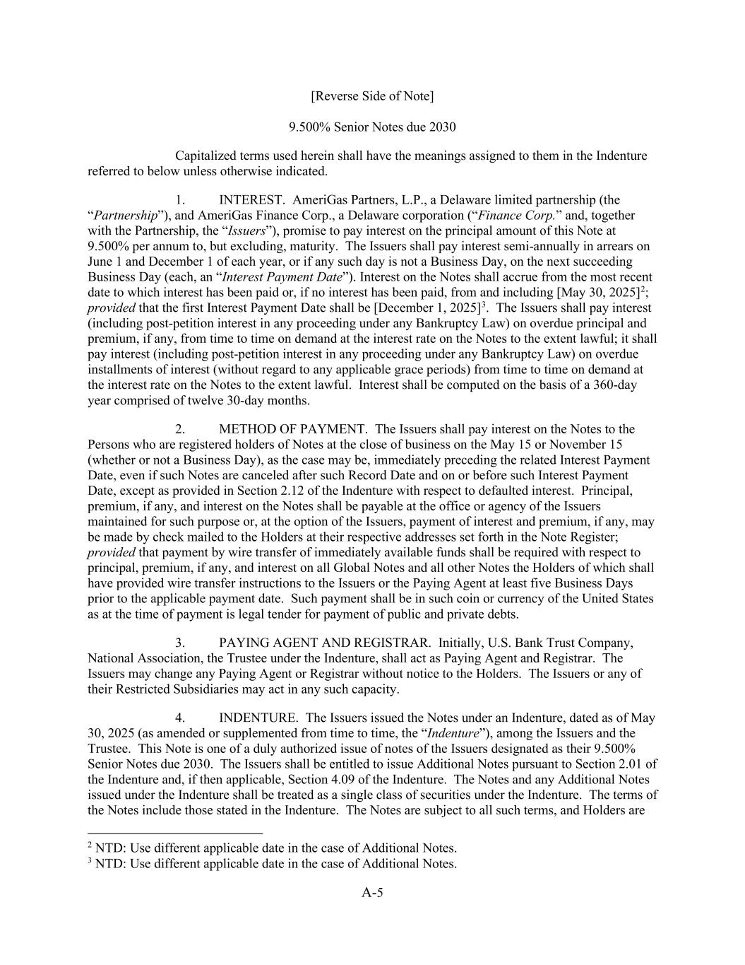 A-5 [票据反面] 2030年到期的9.500%优先票据此处使用的大写术语应具有下文提及的义齿中赋予它们的含义,除非另有说明。1.兴趣。特拉华州有限合伙企业AmeriGas Partners,L.P.(“合伙企业”)和特拉华州公司AmeriGas Finance Corp.(“Finance Corp.”,与合伙企业一起称为“发行人”)承诺按本票据本金的年利率9.500%支付利息至到期日,但不包括到期日。发行人应于每年6月1日和12月1日每半年支付一次利息,如有该日不是营业日,则在下一个营业日(各为“付息日”)支付利息。票据的利息应自已支付利息的最近日期起计,如未支付利息,则自[ 2025年5月30日] 2日(含)起计;但第一个付息日为[ 2025年12月1日] 3日。发行人应在合法范围内按票据利率不时按要求支付逾期本金和溢价(如有)的利息(包括根据任何破产法进行的任何程序的请愿后利息);应在合法范围内按票据利率不时按要求支付逾期分期利息(不考虑任何适用的宽限期)的利息(包括根据任何破产法进行的任何程序的请愿后利息)。利息应按一年360天计算,由十二个30天的月份组成。2.付款方法。发行人须于紧接有关利息支付日期前的5月15日或11月15日(不论是否为营业日)收市时(视属何情况而定)向登记为票据持有人的人士支付票据的利息,即使该等票据在该记录日期后及在该利息支付日期或之前已注销,但义齿第2.12条就违约利息作出的规定除外。票据的本金、溢价(如有)及利息须在发行人为此目的而维持的办事处或代理机构支付,或根据发行人的选择,可将利息及溢价(如有)以支票邮寄予持有人于票据登记册内所列各自地址的方式支付;但须就本金、溢价(如有)以电汇方式支付即时可用资金,所有全球票据和所有其他票据的利息,其持有人应已在适用的付款日期前至少五个工作日向发行人或付款代理人提供电汇指示。这种付款应使用美国的硬币或货币,在付款时是用于支付公共和私人债务的法定货币。3.付款代理人和书记官长。最初,U.S. Bank Trust Company,National Association,the trustee under the Indenture,应担任付款代理人和注册人。发行人可变更任何付款代理人或注册人,而无须通知持有人。发行人或其任何受限制的子公司可以任何此类身份行事。4.indenture。发行人根据日期为2025年5月30日的契约(经不时修订或补充,“契约”)在发行人和受托人之间发行票据。该票据是发行人正式授权发行的票据之一,被指定为其2030年到期的9.500%优先票据。发行人有权根据义齿第2.01节以及(如适用)义齿第4.09节发行附加票据。票据和根据契约发行的任何附加票据应被视为契约下的单一类别证券。票据的条款包括契约中所述的条款。票据受所有此类条款约束,持有人为2新台币:在附加票据的情况下使用不同的适用日期。3新台币:在附加票据的情况下使用不同的适用日期。