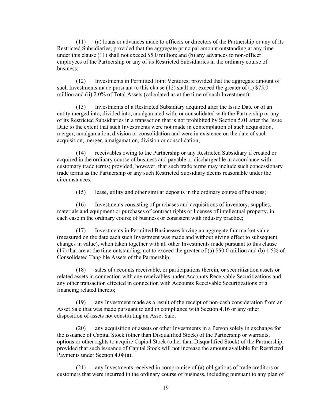 19(11)(a)向合伙企业或其任何受限制子公司的高级职员或董事提供的贷款或垫款;但根据本条款第(11)款在任何时间未偿还的本金总额不得超过500万美元;(b)在正常业务过程中向合伙企业或其任何受限制子公司的非高级职员雇员提供的任何垫款;(12)对许可的合资企业的投资;提供根据本条第(12)款进行的此类投资的总额不得超过(i)7500万美元和(ii)总资产的2.0%(在此类投资时计算)中的较高者;(13)在发行日期后收购的受限制子公司的投资,或在发行日期后不受第5.01条禁止的交易中与合伙企业或其任何受限制子公司合并、分割、合并或合并的实体的投资,前提是此类投资不是在考虑此类收购、合并、合并时进行的,分立或合并,并在该等收购、合并、合并、分立或合并之日存在;(14)应收合伙企业或任何受限制子公司的款项,如果是在正常业务过程中创建或获得的,并根据习惯贸易条款应付或解除;但前提是,该等贸易条款可能包括合伙企业或任何该等受限制子公司在当时情况下认为合理的优惠贸易条款;(15)在正常业务过程中的租赁、公用事业和其他类似存款;(16)包括购买和收购库存、用品、材料和设备或购买知识产权的合同权利或许可,在每种情况下都是在正常经营过程中或符合行业惯例;(17)对具有合计公平市场价值的许可业务的投资(在每项此类投资作出之日计量,且不影响随后的价值变动),当与当时未偿还的根据本条第(17)款作出的所有其他投资一起计算时,不超过(a)5000万美元和(b)合伙企业合并有形资产的1.5%(以较高者为准);(18)出售应收账款,或参与其中,或与应收账款证券化项下的任何应收款有关的证券化资产或相关资产,以及与应收账款证券化或与之相关的融资有关的任何其他交易;(19)因收到根据和遵守第4.16条进行的资产出售的非现金对价而进行的任何投资或不构成资产出售的任何其他资产处置;(20)仅为换取合伙企业的股本(不合格股票除外)或认股权证而对某人进行的任何资产收购或其他投资,获得合伙企业股本(不合格股票除外)的期权或其他权利;但此类股本发行不会增加根据第4.08(a)条可用于限制性付款的金额;(21)在正常业务过程中(包括根据任何计划)因(a)贸易债权人或客户的义务妥协而收到的任何投资