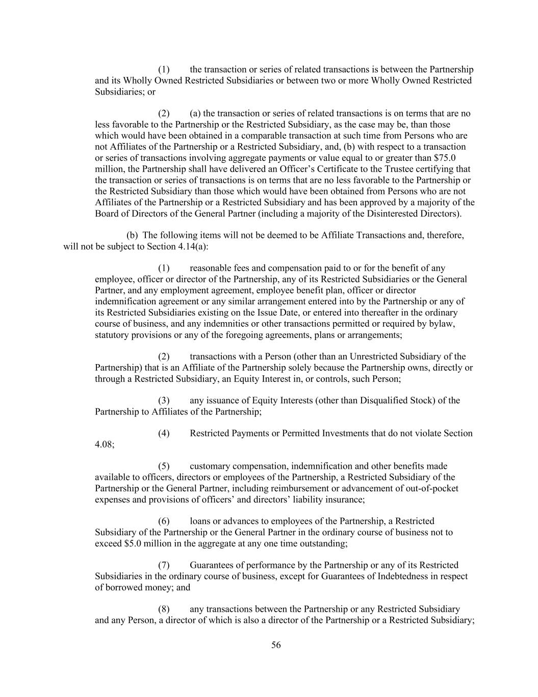 56(1)该交易或一系列关联交易是在合伙企业与其全资受限制子公司之间或两个或多个全资受限制子公司之间进行的;或(2)(a)该交易或一系列关联交易的条款对合伙企业或受限制子公司(视情况而定)不低于当时在可比交易中本应从非合伙企业或受限制子公司的人处获得的条款,并且,(b)就涉及总付款或价值等于或大于7500万美元的交易或系列交易而言,合伙企业应已向受托人交付高级职员证书,证明该交易或系列交易的条款对合伙企业或受限制的子公司不低于本应从非合伙企业或受限制的子公司的关联人士处获得的条款,并已获得普通合伙人董事会过半数(包括大多数无利害关系的董事)的批准。(b)以下项目将不会被视为关联交易,因此将不受第4.14(a)条的约束:(1)向合伙企业的任何雇员、高级职员或董事、其任何受限制子公司或普通合伙人支付或为其利益支付的合理费用和补偿,以及合伙企业或其任何受限制子公司在发行日期存在的任何雇佣协议、雇员福利计划、高级职员或董事赔偿协议或任何类似安排,或其后在正常业务过程中订立的任何类似安排,以及章程、法规条文或任何上述协议、计划或安排所允许或要求的任何赔偿或其他交易;(2)仅因合伙企业直接或通过受限制的子公司拥有该人的股权或控制该人而与该人(合伙企业的非受限制的子公司除外)进行交易;(3)向合伙企业的关联公司发行该合伙企业的任何股权(不合格股票除外);(4)不违反第4.08条的限制性付款或允许投资;(5)惯常补偿,向合伙企业、合伙企业受限制子公司或普通合伙人的高级职员、董事或雇员提供的赔偿和其他福利,包括偿还或垫付自付费用以及高级职员和董事责任保险的规定;(6)向合伙企业员工、合伙企业受限制子公司或普通合伙人在正常经营过程中提供的贷款或垫款,在任何时候未偿还总额不超过500万美元;(7)合伙企业或其任何受限制子公司在正常经营过程中的履约保证,(8)合伙企业或任何受限制附属公司与任何人之间的任何交易,而该人的董事亦是合伙企业或受限制附属公司的董事;