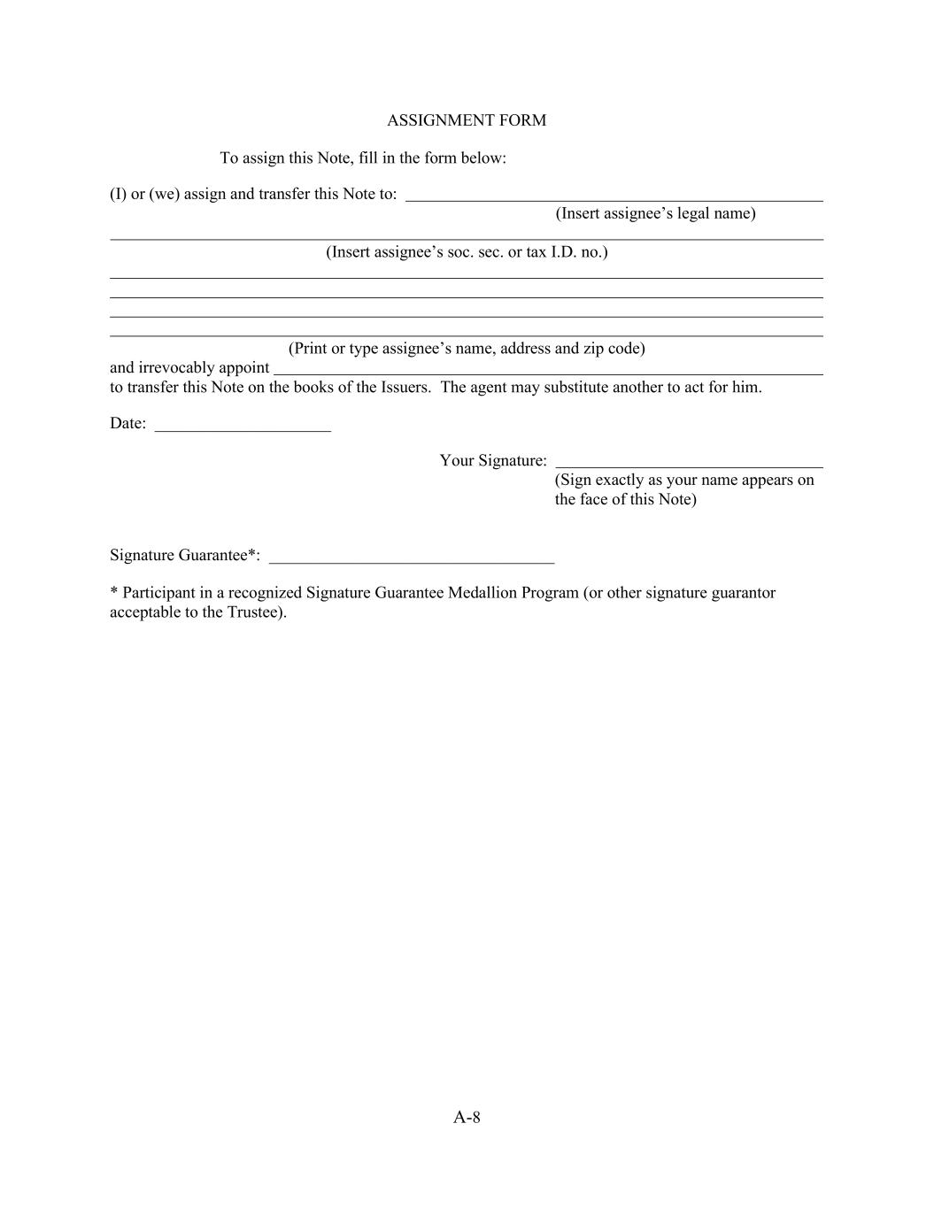 A-8转让表格转让本说明,请填写以下表格:(i)或(我们)将本说明转让并转让给:(插入受让人的法定名称)(插入受让人的soc. sec.or tax ID. no.)(打印或打印受让人的姓名、地址和邮政编码)并不可撤销地指定在发行人的账簿上转让本说明。代理人可以代替另一人代他行事。日期:______________________您的签名:(签名完全如您的名字出现在本说明的正面)签名保证*: __________________________________*参与经认可的签名保证奖章计划(或受托人可接受的其他签名担保人)。