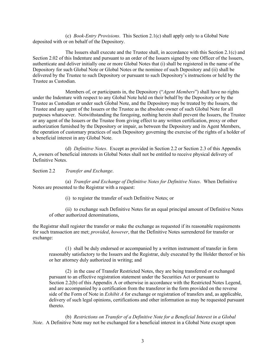 3(c)记账条款。本条第2.1(c)款仅适用于存放于存管人或代表存管人存放的全球票据。发行人须签立,而受托人须按照本指引第2.1(c)条及第2.02条,并依据由发行人的一名高级人员签署的发行人命令,认证并初步交付一张或多于一张全球票据,该等票据(i)须以该全球票据或全球票据的保管人或该保管人的代名人的名义登记,而(ii)须由受托人交付该保管人或根据该保管人的指示交付或由受托人作为保管人持有。存管人的成员或参与者(“代理成员”)对由存管人或作为托管人的受托人代表他们持有的任何全球票据或根据该全球票据持有的任何全球票据,在义齿下不享有任何权利,并且存管人可被发行人、受托人和发行人或受托人的任何代理人视为该全球票据的绝对所有人,无论出于何种目的。尽管有上述规定,本文中的任何内容均不得阻止发行人、受托人或发行人的任何代理人或受托人实施存管人提供的任何书面证明、代理或其他授权,或在存管人与其代理成员之间损害该存管人关于行使任何全球票据实益权益持有人权利的习惯做法的运作。(d)明确说明。除本附录A第2.2节或第2.3节另有规定外,Global Notes的实益权益所有人无权收到确定票据的实物交割。第2.2节转让和交换。(a)将确定票据转让和交换为确定票据。当向注册处处长呈交确定票据并提出以下要求时:(i)登记该等确定票据的转让;或(ii)将该等确定票据兑换为等额本金的其他认可面额的确定票据,注册处处长须在其对该等交易的合理要求得到满足的情况下登记该转让或按要求进行交换;但为转让或交换而交回的确定票据:(1)须妥为背书或附有一份书面转让文书,其格式令发行人和注册处处长合理满意,(2)在转让受限制票据的情况下,这些票据是根据《证券法》或根据本附录A第2.2(b)节或根据受限制票据图例以其他方式根据有效的登记声明进行转让或交换的,并附有转让人以在附件 A中票据表格反面提供的格式提供的证明,用于交换或登记转让,并在适用时提供此类法律意见,认证和根据其可能要求提供的其他信息。(b)对转让全球票据受益权益的确定票据的限制。定式票据不得兑换全球票据的实益权益,除非在