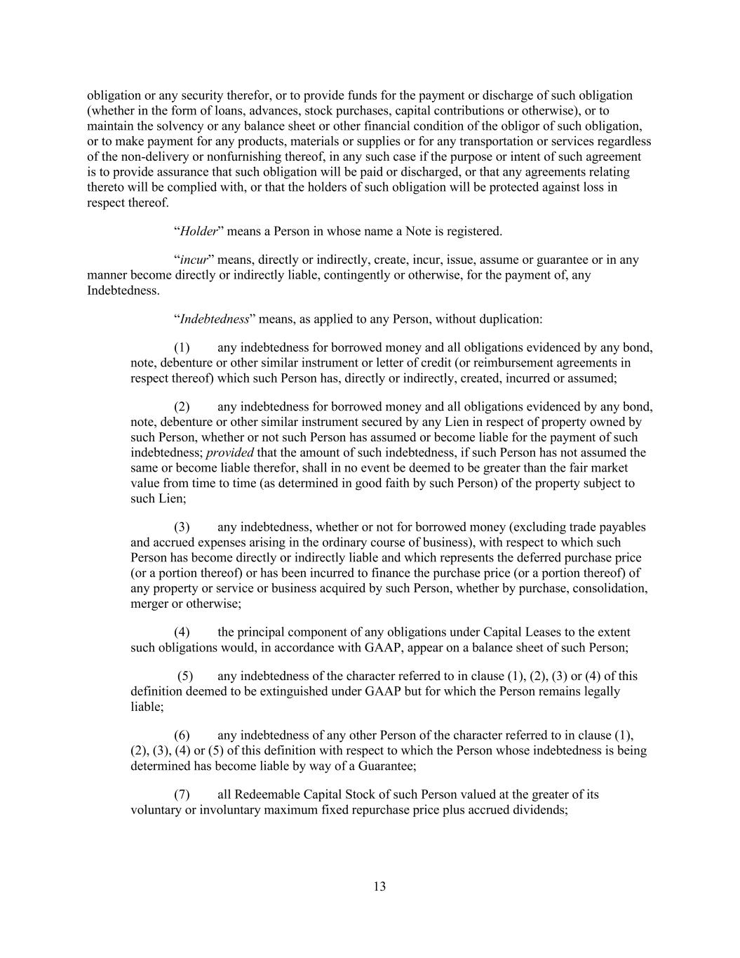 13义务或其任何担保,或为支付或解除该义务提供资金(无论是以贷款、垫款、股票购买、出资或其他形式),或维持该义务义务人的偿债能力或任何资产负债表或其他财务状况,或为任何产品、材料或供应品或任何运输或服务支付款项,无论其是否未交付或未提供,在任何此类情况下,如果该协议的目的或意图是提供保证该义务将被支付或解除,或任何与此有关的协议将得到遵守,或此类义务的持有人将受到保护,免受与此有关的损失。“持有人”是指以其名义登记票据的人。“招致”是指,直接或间接地,创造、招致、发行、承担或担保,或以任何方式直接或间接地,或有或以其他方式,对任何债务的支付承担责任。“负债”是指,适用于任何人,不重复:(1)该人已直接或间接设定、招致或承担的任何债券、票据、债权证或其他类似票据或信用证(或与其有关的偿付协议)所证明的借入资金的任何债务和所有债务;(2)借入资金的任何债务和任何债券、票据、债权证或其他类似票据所证明的所有债务,这些债务由该人所拥有的财产的任何留置权所担保,不论该人是否已就该等债务承担或承担偿付责任;但如该人并无承担该等债务或承担该等债务的责任,则在任何情况下均不得视为高于受该等留置权所规限的财产的不时公平市场价值(由该人善意厘定);(3)任何债务,不论是否为所借款项(不包括贸易应付款项及日常业务过程中产生的应计费用),该等人士已对其直接或间接承担责任,且代表递延购买价格(或其一部分),或已招致为该等人士所取得的任何物业、服务或业务的购买价格(或其一部分)提供融资,不论是透过购买、合并、合并或其他方式;(4)资本租赁项下任何义务的主要组成部分,只要该等义务按照公认会计原则会出现在该人士的资产负债表上;(5)第(1)、(2)条所指性质的任何债务,(3)或(4)本定义根据公认会计原则被视为已消灭但该人仍负有法律责任;(6)本定义第(1)、(2)、(3)、(4)或(5)条所提述性质的任何其他人的任何债务,而其债务正在被确定的人已通过担保的方式对其承担责任;(7)该人的所有可赎回股本按其自愿或非自愿的最高固定回购价格加上应计股息中的较高者估值;
