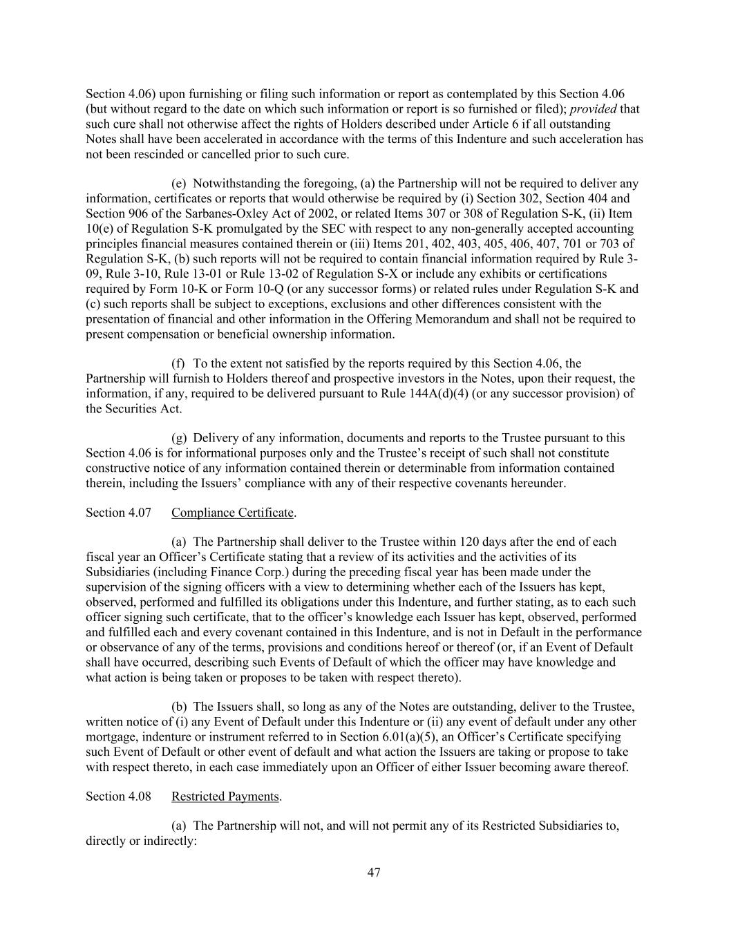 47第4.06条)在提供或归档本条第4.06条所设想的信息或报告时(但不考虑如此提供或归档此种信息或报告的日期);但此种补救不应以其他方式影响第6条所述的持有人的权利,前提是所有未偿还票据应已按照本义齿的条款加速,且此种加速在此种补救之前尚未被撤销或取消。(e)尽管有上述规定,(a)合伙企业将不会被要求交付(i)2002年《萨班斯-奥克斯利法案》第302条、第404条和第906条或S-K条例第307或308项相关要求的任何信息、证书或报告,(ii)SEC就其中所载的任何非公认会计原则财务措施颁布的S-K条例第10(e)项或(iii)S-K条例第201、402、403、405、406、407、701或703项要求的任何信息、证书或报告,(b)该等报告将无须载有条例S-X第3-09条、第3-10条、第13-01条或第13-02条所规定的财务资料,或包括表格10-K或表格10-Q(或任何后续表格)或条例S-K及(c)项下相关规则所规定的任何证物或证明,而该等报告须受与发售备忘录中财务及其他资料的列报相一致的例外、排除及其他差异所规限,并无须呈列补偿或实益拥有权资料。(f)在本节4.06要求的报告未得到满足的情况下,合伙企业将应票据持有人和潜在投资者的请求,向其提供根据《证券法》第144A(d)(4)条(或任何后续条款)要求交付的任何信息(如有)。(g)依据本条第4.06条向受托人交付任何资料、文件和报告仅供参考之用,受托人收到这些资料、文件和报告不应构成对其中所载或可从其中所载信息确定的任何信息的建设性通知,包括发行人遵守其各自根据本协议订立的任何契诺。第4.07节合规证书。(a)合伙企业应在每个财政年度结束后的120天内向受托人交付一份高级职员证书,说明已在签署人员的监督下对其活动及其子公司(包括财务公司)在上一个财政年度的活动进行了审查,以确定每个发行人是否保持、遵守、履行和履行了其在本契约下的义务,并就每个签署该证书的该高级职员而言,进一步说明,据该高级职员所知,每个发行人都保持、遵守,履行和履行了本契约中包含的每一项契诺,并且在履行或遵守本契约或其任何条款、规定和条件方面没有违约(或者,如果违约事件应已发生,则描述该高级职员可能知道的违约事件以及正在就此采取或提议采取的行动)。(b)发行人须在任何票据尚未偿付的情况下,向受托人交付(i)本契约下的任何违约事件或(ii)第6.01(a)(5)条所提述的任何其他按揭、契约或票据下的任何违约事件的书面通知,指明该违约事件或其他违约事件的高级人员证明书,以及发行人就该等事件正在采取或建议采取的行动,在每宗个案中,须在任一发行人的高级人员知悉后立即交付。第4.08节限制付款。(a)合伙企业不会、也不会允许其任何受限制的子公司直接或间接地: