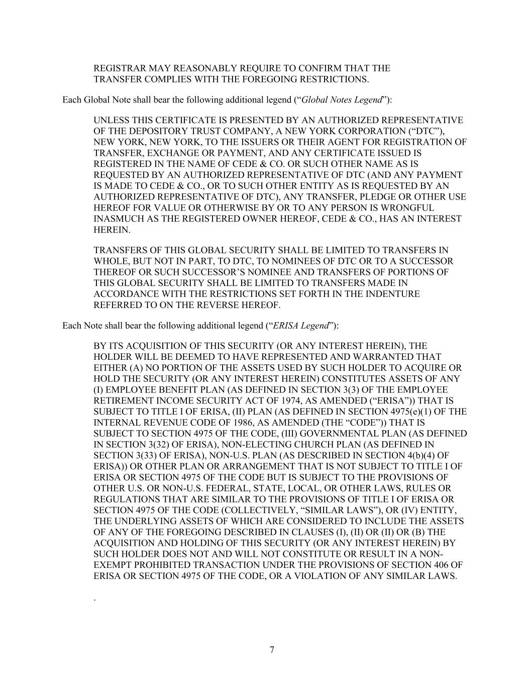 7书记官长可合理要求确认转让符合上述限制。每份环球票据须附加以下图例(“环球票据图例”):除非本证明书由存管信托公司、纽约公司(“DTC”)的授权代表于纽约州纽约市向发行人或其代理人提出转让、交换或付款登记,且所发出的任何证明书均以CEDE & CO的名义登记。或DTC的授权代表要求的其他名称(以及向CEDE & CO.,或DTC的授权代表要求的其他实体),任何人或以其他方式为价值进行的任何转让、质押或使用此处进行的任何转让、质押或其他使用均属错误,因为在此登记的拥有人CEDE & CO.在此拥有权益。本全球证券的转让应限于全部而非部分地转让给DTC、给DTC的提名人或其继任者或该继任者的提名人,且本全球证券的部分转让应限于根据此处所述契约中规定的限制进行的转让。每份票据应附有以下附加图例(“ERISA图例”):通过其获得本证券(或此处的任何权益),持有人将被视为已代表并保证(a)该持有人用于获得或持有该证券(或此处的任何权益)的资产的任何部分均不构成任何(i)雇员福利计划(如雇员退休收入第3(3)节所定义)的资产(ii)受守则第4975节规限的计划(如经修订的1986年《内部收入守则》第4975(e)(1)条所界定(“守则”))、(iii)政府计划(如ERISA第3(32)条所界定)、非选举教会计划(如ERISA第3(33)条所界定)、非美国计划(如ERISA第4(b)(4)条所述)或其他不受TITITG规限的计划或安排与ERISA标题I或《守则》第4975节(统称“类似法律”)或(IV)实体的规定类似的规则或条例,其基础资产被视为包括第(i)、(II)或(II)条或(b)条中所述的上述任何一项的资产,而该等持有人收购和持有该证券(或此处的任何权益)并不及或违反任何类似法律。。