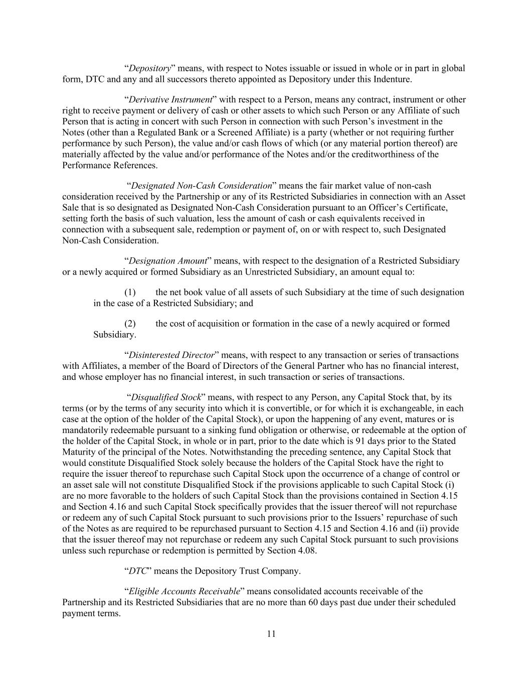 11“存管人”是指,就可发行或全部或部分以全球形式发行的票据而言,DTC及其任何和所有继任者根据本契约被指定为存管人。就某人而言,“衍生工具”指该人或与该人一致行动的该人的任何关联公司(受监管银行或经筛选的关联公司除外)作为一方当事人(无论是否要求该人进一步履行)的任何合同、票据或其他收取现金或其他资产付款或交付的权利,其价值和/或现金流量(或其任何重要部分)受到票据价值和/或业绩和/或业绩参考的信誉的重大影响。“指定非现金对价”是指合伙企业或其任何受限制子公司就根据高级职员证书被指定为指定非现金对价的资产出售而收到的非现金对价的公允市场价值,其中载明了此类估值的基础,减去就后续出售、赎回或支付此类指定非现金对价而收到的现金或现金等价物的金额。“指定金额”是指,就指定受限制子公司或新收购或组建的子公司为非受限制子公司而言,金额等于:(1)在受限制子公司的情况下,该子公司在该指定时的所有资产的账面净值;(2)在新收购或组建的子公司的情况下,收购或组建的成本。“无利害关系董事”是指,就与关联公司的任何交易或系列交易而言,普通合伙人的董事会成员在此类交易或系列交易中没有经济利益,其雇主也没有经济利益。“不合格股票”就任何人而言,是指根据其条款(或根据其可转换成或可交换的任何证券的条款,在每种情况下由股本持有人选择),或在任何事件发生时,到期或根据偿债基金义务或其他方式强制赎回,或可由股本持有人选择全部或部分赎回的任何股本,在票据本金的规定到期日之前91天的日期之前。尽管有前一句话,任何仅因股本持有人有权要求其发行人在发生控制权变更或资产出售时回购该股本而构成不合格股票的股本不构成不合格股票如适用于该股本(i)的条文对该股本的持有人并不比第4.15条和第4.16条所载的条文更有利,而该股本特别规定,在发行人回购根据第4.15条和第4.16和(ii)条规定须回购的票据之前,其发行人将不会根据该等条文回购或赎回任何该等股本发行人不得根据该等规定回购或赎回任何该等股本,除非该等回购或赎回获第4.08条许可。“DTC”是指存款信托公司。“合格应收账款”是指合伙企业及其受限制子公司根据其预定付款条款逾期不超过60天的综合应收账款。