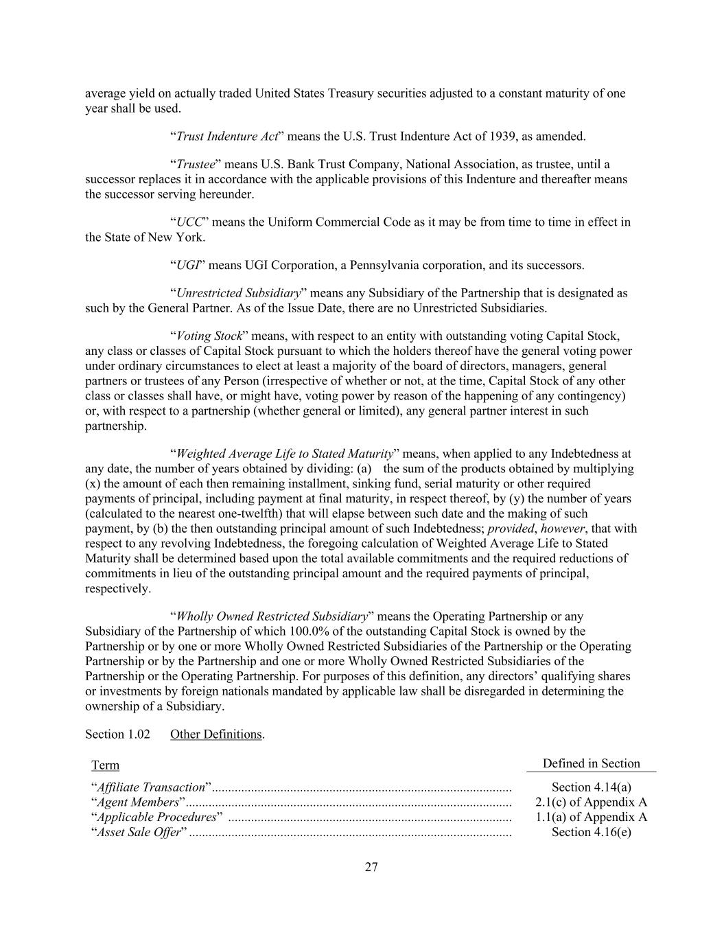 27实际交易的美国国债调整为一年恒定期限的平均收益率应予使用。“信托契约法案”是指经修订的1939年美国信托契约法案。“受托人”是指美国银行信托公司、全国协会,作为受托人,直到继任者根据本契约的适用条款取代它,此后是指根据本契约服务的继任者。「 UCC 」指于纽约州不时生效的统一商法典。“UGI”是指宾夕法尼亚州的一家公司UGI公司及其继任者。“无限制附属公司”是指合伙企业中被普通合伙人指定为无限制附属公司的任何附属公司。截至发行日,不存在无限售条件的子公司。“有表决权股份”是指,就拥有已发行有表决权股本的实体而言,任何类别或类别的股本,据此,其持有人在一般情况下拥有一般投票权,以选举任何人的董事会、经理、普通合伙人或受托人至少过半数(无论当时任何其他类别或类别的股本是否因任何或有事项的发生而拥有或可能拥有投票权),或就合伙企业(无论普通或有限)而言,该合伙企业中的任何普通合伙人权益。“规定到期日的加权平均期限”是指,当适用于任何日期的任何债务时,通过以下方式获得的年数:(a)通过将(x)每一期当时剩余的分期付款、偿债基金、连续到期日或其他所需的本金付款(包括最终到期日的付款)的金额乘以(y)从该日期到支付该款项之间将经过的年数(以最接近的十二分之一计算)乘以(b)该债务当时未偿还的本金金额而获得的产品的总和;但是,前提是,就任何循环债务而言,上述加权平均期限至规定到期日的计算应分别根据可用承诺总额和代替未偿本金金额和所需本金支付的承诺所需减少额来确定。“全资受限子公司”指经营合伙企业或合伙企业的任何子公司,其100.0%的流通股本由合伙企业或合伙企业或经营合伙企业的一家或多家全资受限子公司拥有或由合伙企业及合伙企业或经营合伙企业的一家或多家全资受限子公司拥有。就本定义而言,在确定子公司的所有权时,应忽略适用法律规定的外国国民的任何董事合格股份或投资。第1.02节其他定义。“关联交易”一节中定义的术语...................................................................................................。附录A“适用程序”第4.14(a)节“代理成员”.................................................................................... 2.1(c)....................................................................................附录A“资产出售要约”第1.1(a)节...................................................................................。第4.16(e)节)