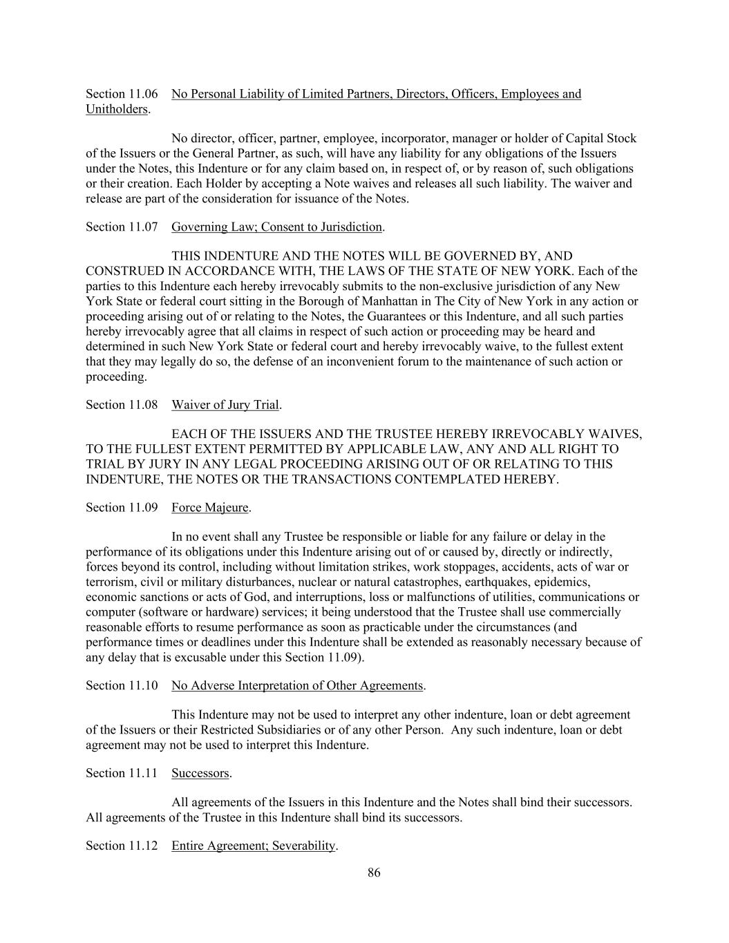 86第11.06节没有有限合伙人、董事、高级职员、雇员和单位持有人的个人责任。发行人或普通合伙人的任何董事、高级职员、合伙人、雇员、注册人、经理或股本持有人本身,均不对发行人在票据、本义齿项下的任何义务或基于、关于或由于此类义务或其创设的任何索赔承担任何责任。每一持有人通过接受一张票据而免除和解除所有此类责任。豁免和发行是发行票据考虑的一部分。第11.07条管辖法律;同意管辖。这份契约和票据将由纽约州的法律管辖,并按照纽约州的法律进行建造。本契约的每一方均在此不可撤销地服从任何纽约州或设在纽约市曼哈顿区的联邦法院在由票据、担保或本契约引起或与之相关的任何诉讼或程序中的非专属管辖权,并且所有这些方在此不可撤销地同意,与该诉讼或程序有关的所有索赔可在该纽约州或联邦法院进行审理和裁定,并在此不可撤销地放弃,在他们可以合法地这样做的最大范围内,不方便的诉讼地对维持该诉讼或程序的抗辩。第11.08节放弃陪审团审判。每一发行人和受托人在此不可撤销地放弃在适用法律允许的最大限度内,在因本契约、票据或此处设想的交易而产生或与之有关的任何法律程序中由陪审团审判的任何和所有权利。第11.09节不可抗力。在任何情况下,任何受托人均不得对其无法控制的力量(包括但不限于罢工、停工、事故、战争或恐怖主义行为、民事或军事骚乱、核或自然灾害、地震、流行病、经济制裁或天灾,以及公用事业的中断、损失或故障)所引起或直接或间接造成的任何未能或延迟履行其在本契约下的义务承担责任或承担责任,通信或计算机(软件或硬件)服务;有一项谅解,即受托人在有关情况下应使用商业上合理的努力尽快恢复履行(而本契约下的履行时间或截止日期应因根据本条第11.09条可原谅的任何延迟而在合理需要时延长)。第11.10节没有对其他协议的不利解释。本契约不得用于解释发行人或其受限制子公司或任何其他人的任何其他契约、贷款或债务协议。任何此类契约、贷款或债务协议不得用于解释本契约。第11.11节继任者。发行人在本契约和票据中的所有协议均对其继承人具有约束力。受托人在本契约中的所有协议对其继承人具有约束力。第11.12节整个协议;可分割性。