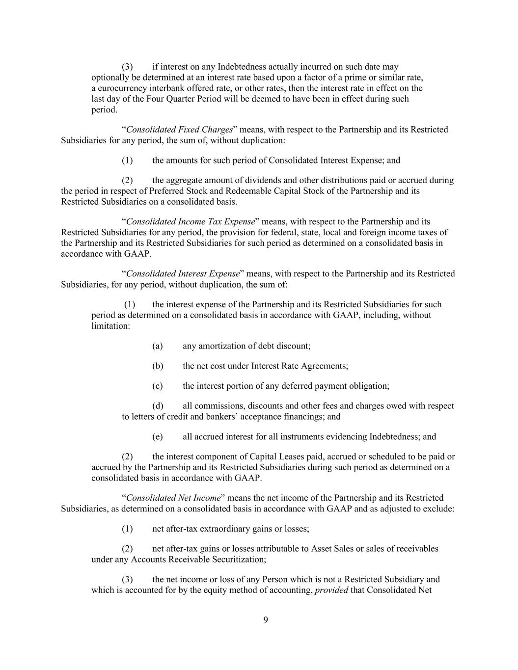 9(3)如果在该日期实际发生的任何债务的利息可选择性地按基于最优惠利率或类似利率、欧元货币银行间同业拆借利率或其他利率的因素确定的利率,则在第四季度期间最后一天生效的利率将被视为在该期间内已经生效。“合并固定费用”是指,就合伙企业及其受限制子公司的任何期间而言,以下各项的总和,不重复:(1)该期间合并利息费用的金额;(2)在合并基础上就合伙企业及其受限制子公司的优先股和可赎回股本在该期间支付或应计的股息和其他分配的总额。“合并所得税费用”是指,就合伙企业及其受限制子公司的任何期间而言,根据公认会计原则在合并基础上确定的合伙企业及其受限制子公司的联邦、州、地方和外国所得税拨备。“合并利息费用”是指,就合伙企业及其受限制子公司而言,在任何期间,不重复:(1)合伙企业及其受限制子公司在根据公认会计原则在合并基础上确定的期间的利息费用,包括但不限于:(a)债务折扣的任何摊销;(b)利率协议下的净成本;(c)任何延期付款义务的利息部分;(d)所有佣金,与信用证和银行承兑融资有关的折扣和其他费用和收费;(e)所有证明债务的工具的所有应计利息;(2)合伙企业及其受限制子公司在根据公认会计原则在综合基础上确定的期间内支付、应计或计划支付或应计的资本租赁的利息部分。“合并净收益”指根据公认会计原则在合并基础上确定并经调整以排除:(1)税后非经常性损益净额;(2)任何应收账款证券化项下资产出售或应收款项出售应占税后损益净额;(3)任何非受限制子公司且采用权益会计法核算的人的净收益或亏损,前提是合并净