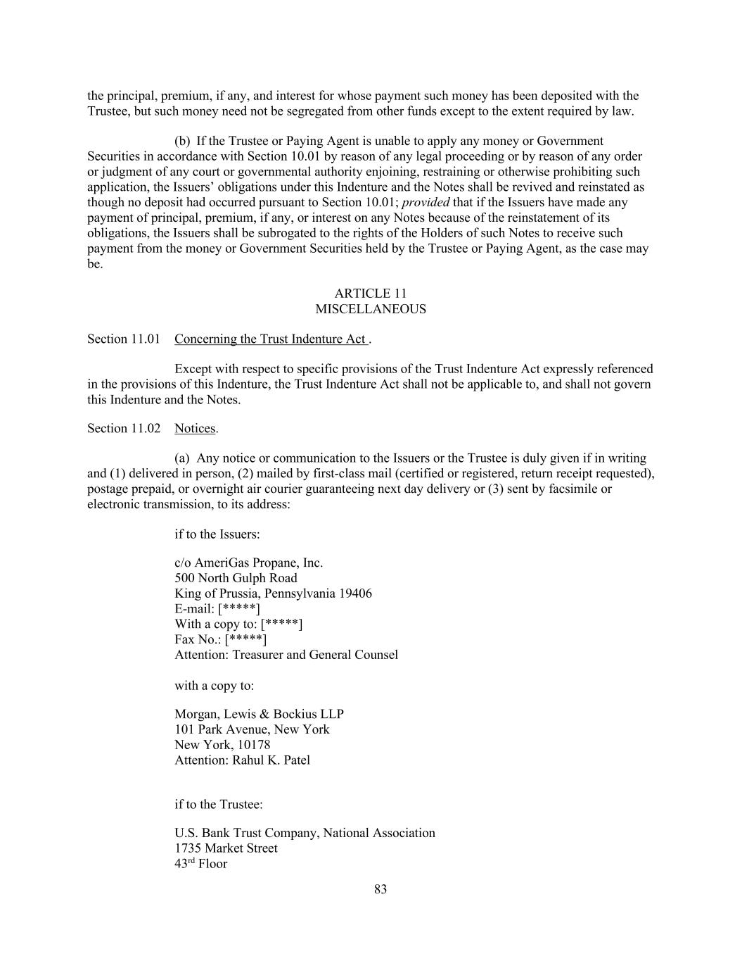 83本金、溢价(如有)和利息已存入受托人,但除法律要求的范围外,此类款项不必与其他资金分开。(b)如受托人或付款代理人因任何法律程序或因任何法院或政府当局的任何命令或判决禁止、限制或以其他方式禁止该等申请而无法根据第10.01条申请任何款项或政府证券,则发行人在本契约及票据下的义务须恢复及恢复,犹如根据第10.01条并无发生存款一样;但如发行人已因其义务的恢复而就任何票据支付任何本金、溢价(如有的话)或利息,发行人应代位行使该等票据持有人从受托人或付款代理人(视情况而定)持有的款项或政府证券收取该等款项的权利。第11条杂项第11.01条涉及《信托契约法》。除本契约条款中明确提及的《信托契约法》的具体条款外,《信托契约法》不适用于本契约和票据,也不适用于本契约和票据。第11.02节通知。(a)向发行人或受托人发出的任何通知或通讯,如以书面形式及(1)亲自送达,(2)以头等邮件(经核证或挂号,要求回执)、预付邮资或保证次日送达的隔夜航空快递邮寄,或(3)以传真或电子传送方式寄发,则妥为发出,寄往其地址:if致发行人:c/o AmeriGas Propane,Inc. 500 North Gulph Road King of Prussia,Pennsylvania 19406电子邮件:[*****]附一份至:[*****]传真号码:[*****】关注:财务主管兼总法律顾问,副本至:Morgan,Lewis & Bockius LLP 101 Park Avenue,纽约纽约,10178关注:Rahul K. Patel if to the Trustee:U.S. Bank Trust Company,National Association 1735 Market Street 43rd Floor