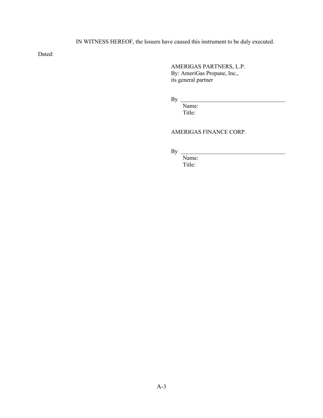 A-3在此作证,发行人已促使正式签署本文书。日期:AMERIGAS PARTNERS,L.P. by:AmeriGas Propane,Inc.,其普通合伙人by name:title:AMERIGAS Finance CORP。按名称:标题: