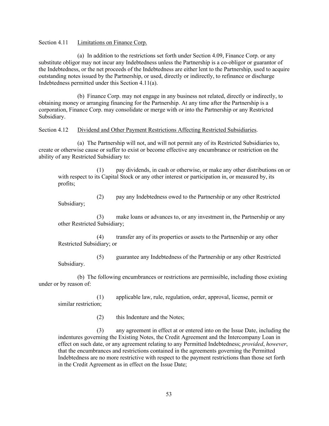 53第4.11节对Finance Corp.的限制(a)除第4.09节规定的限制外,Finance Corp.或任何替代债务人不得产生任何债务,除非合伙企业是债务的共同债务人或担保人,或债务的净收益要么借给合伙企业,要么用于收购合伙企业发行的未偿还票据,要么直接或间接用于再融资或解除本第4.11(a)节允许的债务。(b)Finance Corp.不得从事与为合伙企业获得资金或安排融资没有直接或间接关系的任何业务。在合伙企业成为公司后的任何时间,Finance Corp.可以与合伙企业或任何受限制的子公司合并或合并。第4.12节影响受限制子公司的股息和其他支付限制。(a)合伙企业不会、也不会允许其任何受限制的附属公司设立或以其他方式导致或遭受对任何受限制的附属公司的能力存在或生效的任何产权负担或限制:(1)以现金或其他方式支付股息,或就其股本或其任何其他权益或参与其利润或以其利润计量作出任何其他分配;(2)支付欠合伙企业或任何其他受限制的附属公司的任何债务;(3)向其提供贷款或垫款,或对其进行任何投资,合伙企业或任何其他受限制的附属公司;(4)将其任何财产或资产转让给合伙企业或任何其他受限制的附属公司;或(5)为合伙企业或任何其他受限制的附属公司的任何债务提供担保。(b)以下产权负担或限制是允许的,包括根据或由于以下原因而存在的产权负担或限制:(1)适用的法律、规则、条例、命令、批准、许可、许可或类似的限制;(2)本契约和票据;(3)在发行日期有效或订立的任何协议,包括管辖在该日期有效的现有票据、信贷协议和公司间贷款的契约,或与任何允许的债务有关的任何协议;但前提是,关于许可债务的协议中所载的产权负担和限制对付款限制的限制不高于信贷协议中规定的在发行日生效的限制;