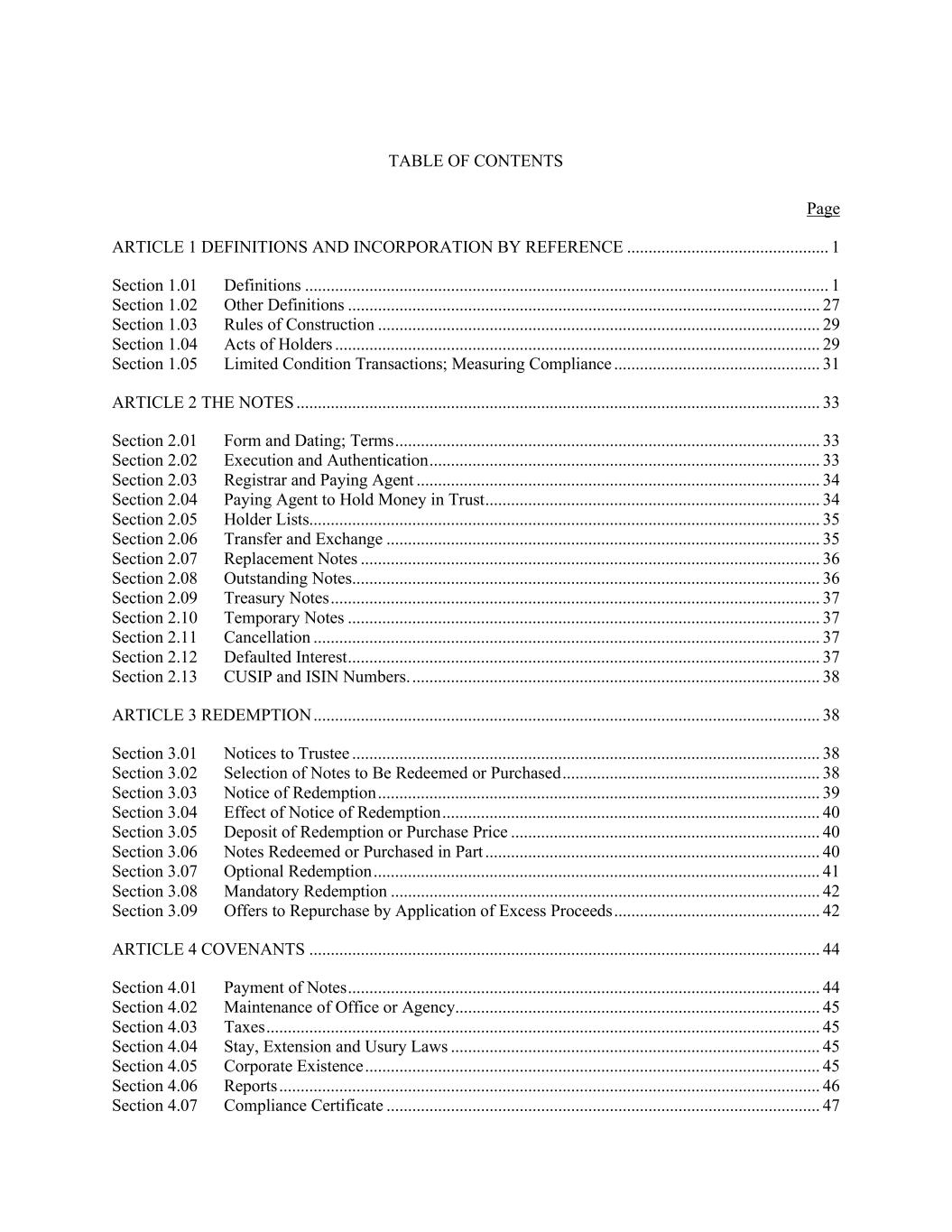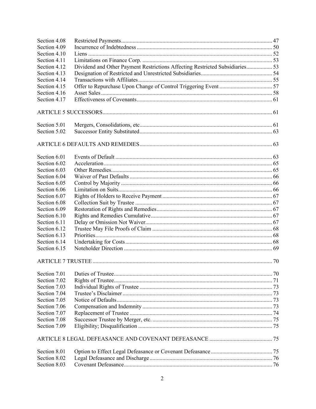 2第4.08节受限制的付款.......................................................................................47第4.09节债务的发生...................................................................................................................50第4.10节留置权.......................................................................................................52第4.11节对Finance Corp.的限制.......................................................................................53第4.12节影响受限制子公司的股息和其他支付限制..................53第4.13节受限制和不受限制子公司的指定.......................................................54第4.14节与关联公司的交易......................................................................55第4.15节控制权变更触发事件时的回购要约.......................................57第4.16节资产出售....................................................................................................................58第4.17节契诺的效力....................................................................................61条第5款接任者....................................................................................................................61第5.01节合并 等.....................................................................61第5.02条继承实体被取代.....................................................................................................63第6.01条违约事件.....................................................................................................63第6.02条加速处理.....................................................................................................65第6.03条其他补救措施.....................................................................................65第6.04条对过去违约的放弃.....................................................................................................................................66第6.06条诉讼时效.....................................................................................................................66第6.07条持有人收取款项的权利....................................................................................67第6.08条受托人的催收诉讼................................................................................................................67第6.09条重述及补救措施累计...................................................................................67第6.11节延迟或遗漏不放弃................................................................................67第6.12节受托人可提出债权证明................................................................................................68第6.13节优先事项................................................................................................68第6.14节对费用的承诺................................................................................................................68第6.15节票据持有人指示.......................................................................................................................69条第7款受托人的职责...................................................................................................................................................70第7.01节受托人的职责......................................................................................................................................................................70第7.02节受托人的权利....................................................................................................................71第7.03节受托人的个人权利....................................................................................................73第7.04节受托人的免责声明....................................................................................................................................................73第7.05节及弥偿...................................................................................73第7.07条更换受托人...................................................................................74第7.08条合并等方式的继任受托人....................................................................75第7.09条资格;取消资格....................................................................................75第8条法律抗辩和《盟约》抗辩....................................................75第8.01条实施法律抗辩或《盟约》抗辩的选择权....................................75第8.02条法律抗辩和解除责任....................................................................................76第8.03条《盟约抗辩》