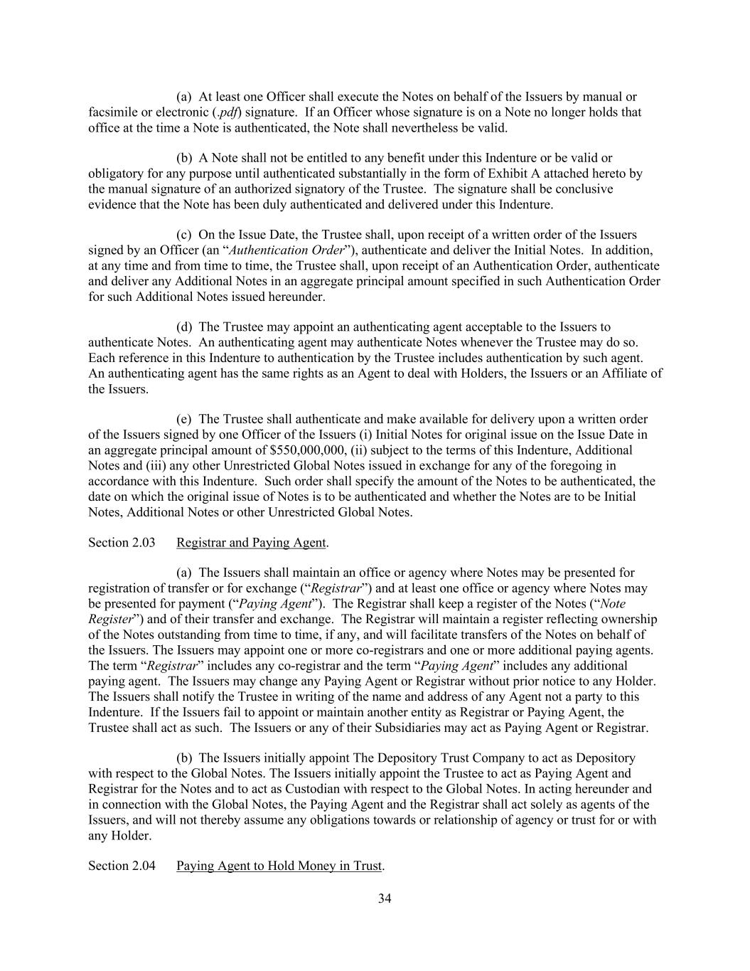 34(a)至少一名人员须以手工或传真或电子(.pdf)签字的方式代表发行人签立《说明》。如任何人员在一份说明上签名,在该说明认证时已不再担任该职务,则该说明仍然有效。(b)在经受托人的获授权签字人手工签署后,票据在基本上以本契约所附的附件 A形式认证之前,不得有权根据本契约获得任何利益,或在任何目的上均属有效或强制性。签字应为票据已根据本义齿正式认证和交付的确凿证据。(c)在发行日期,受托人在收到由高级人员签署的发行人的书面命令(“认证命令”)后,须认证并交付初始票据。此外,在任何时间及不时,受托人在收到认证令后,须就根据本协议发行的该等附加票据认证及交付该认证令所指明的本金总额的任何附加票据。(d)受托人可委任发行人可接受的认证代理人对票据进行认证。认证代理人可以在受托人可以认证Notes的任何时候进行认证。本Indenture中对受托人身份验证的每个引用都包括此类代理的身份验证。认证代理人与代理人有同等权利与持有人、发行人或发行人的关联机构进行交易。(e)受托人须根据发行人的一名高级人员签署的发行人的书面命令认证并可供交付(i)在发行日为原始发行的本金总额为550,000,000美元的初始票据,(ii)受本契约、附加票据和(iii)根据本契约为交换任何上述内容而发行的任何其他非限制性全球票据的条款所规限。该命令应指明待认证票据的金额、原始发行票据的认证日期以及票据是否为初始票据、附加票据或其他非限制性全球票据。第2.03节注册人和付款代理人。(a)发行人应维持一个可出示票据以进行转让登记或交换的办事处或机构(“注册处处长”)和至少一个可出示票据以进行付款的办事处或机构(“付款代理人”)。书记官长须备存票据登记册(“票据登记册”)及其转让及兑换纪录册。书记官长将维持一份登记册,反映不时(如有的话)未偿还票据的所有权,并将代表发行人为票据的转让提供便利。发行人可指定一名或多名共同登记人和一名或多名额外付款代理人。“注册商”一词包括任何共同注册商,“付款代理”一词包括任何额外的付款代理。发行人可变更任何付款代理人或注册人,而无须事先通知任何持有人。发行人应将非本契约当事人的任何代理人的姓名、地址书面通知受托人。发行人未能指定或维持其他实体作为注册人或付款代理人的,由受托人担任。发行人或其任何子公司可以作为付款代理人或注册人。(b)发行人最初指定存托信托公司担任全球票据的存管人。发行人初步委任受托人担任票据的付款代理人及注册人,并就全球票据担任托管人。在根据本协议行事及与全球票据有关时,付款代理人及注册官应仅作为发行人的代理人行事,并不因此而对任何持有人或与任何持有人承担任何义务或代理或信托关系。第2.04款付款代理人以信托方式持款。
