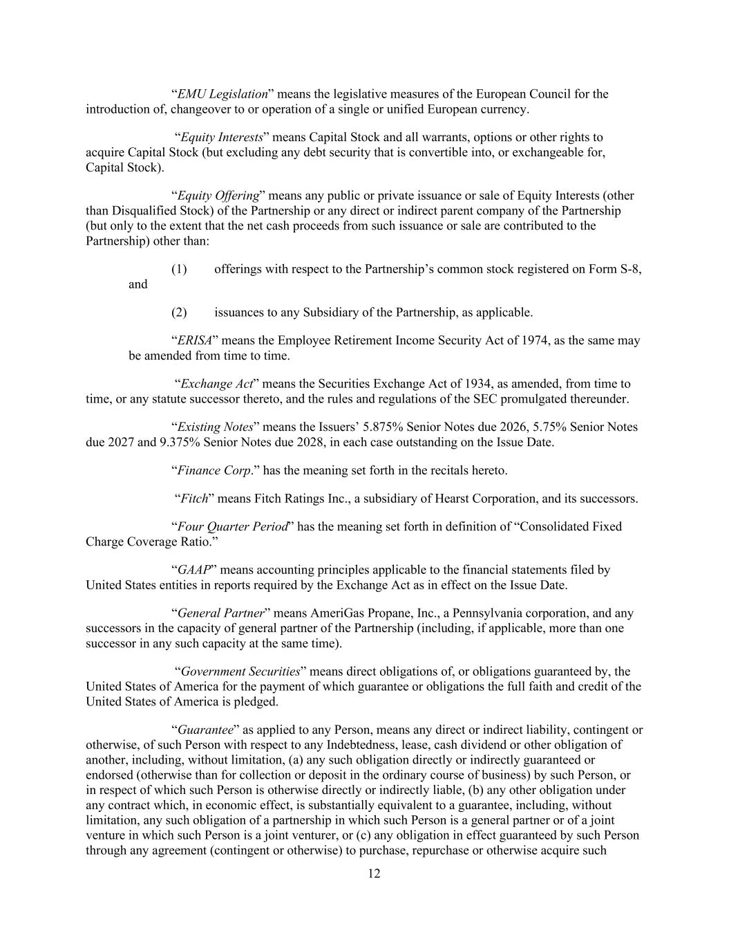 12“动车组立法”是指欧洲理事会对单一或统一欧洲货币的引进、转换或运营的立法措施。“股权”是指股本和所有认股权证、期权或其他获得股本的权利(但不包括任何可转换为或可交换为股本的债务证券)。“股权发售”是指任何公开或非公开发行或出售合伙企业或合伙企业的任何直接或间接母公司的股权(不合格股票除外)(但仅限于此类发行或出售的现金净收益贡献给合伙企业),但以下情况除外:(1)就登记在表格S-8上的合伙企业普通股进行发售,以及(2)向合伙企业的任何子公司(如适用)发行。“ERISA”是指1974年《雇员退休收入保障法》,因为该法案可能会不时修订。“交易法”是指经不时修订的1934年《证券交易法》或其任何法规继承者,以及SEC据此颁布的规则和条例。“现有票据”指发行人于2026年到期的5.875%优先票据、2027年到期的5.75%优先票据和2028年到期的9.375%优先票据,在每种情况下均于发行日未偿还。“金融公司”的含义在这里的独奏会中阐述。“惠誉”是指赫斯特公司旗下的惠誉国际评级公司及其继任者。“四季期”具有“合并固定费用覆盖率”定义中阐述的含义。“GAAP”是指适用于美国实体在《交易法》要求的报告中提交的财务报表的会计原则,自发布之日起生效。“普通合伙人”是指AmeriGas Propane,Inc.,一家宾夕法尼亚州公司,以及以合伙企业普通合伙人身份的任何继任者(如适用,包括同时以任何此类身份的多名继任者)。“政府证券”是指美利坚合众国的直接义务或由其担保的义务,其担保或义务是美利坚合众国的完全信用和信用。适用于任何人的“保证”指该人就他人的任何债务、租赁、现金股息或其他义务而承担的任何直接或间接责任,或有或其他责任,包括但不限于(a)由该人直接或间接担保或背书(在正常业务过程中收取或存入除外)的任何该等义务,或该人以其他方式直接或间接承担责任的任何该等义务,(b)任何合同项下在经济上实质上等同于担保的任何其他义务,包括但不限于,该等人士为普通合伙人的合伙企业或该等人士为合营者的合营企业的任何该等义务,或(c)该等人士透过任何协议(或有协议或其他协议)有效担保的任何购买、回购或以其他方式取得该等