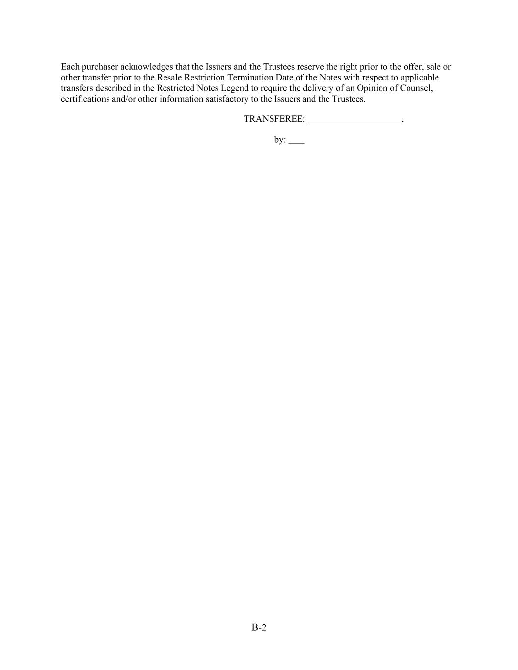 B-2各买方承认,发行人和受托人保留在票据的转售限制终止日期之前的要约、出售或其他转让之前就受限制票据图例中描述的适用转让要求交付律师意见、证明和/或发行人和受托人满意的其他信息的权利。受让人:,由: