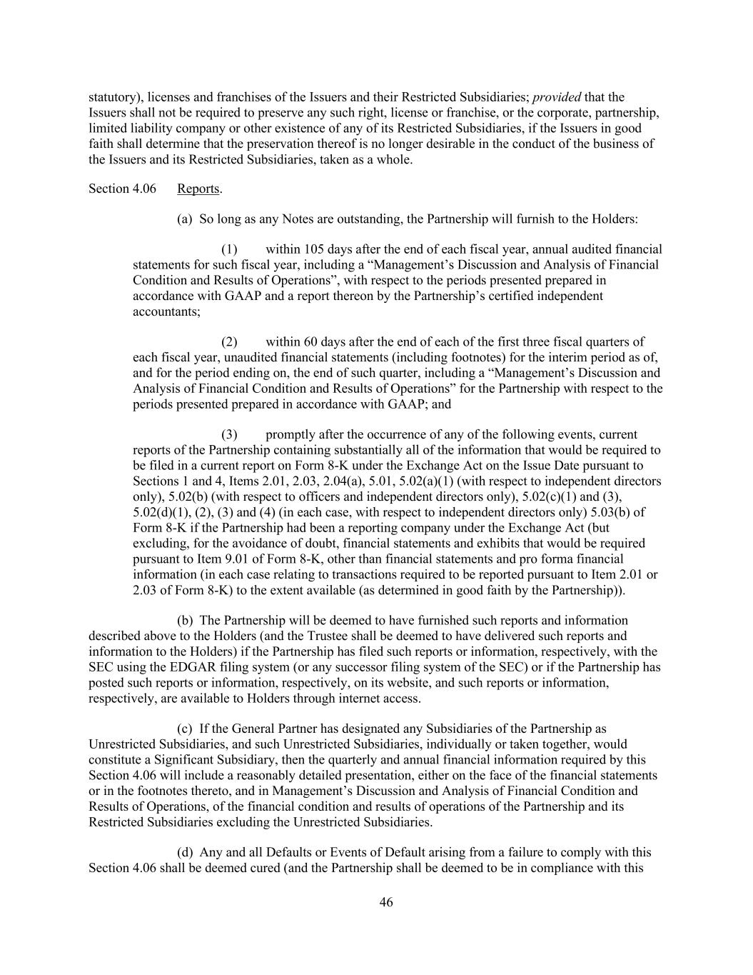 46法定)、发行人及其受限子公司的许可和特许经营权;但不得要求发行人保留任何此类权利、许可或特许经营权,或其任何受限子公司的公司、合伙企业、有限责任公司或其他存在,如果发行人善意地认定,在发行人及其受限子公司整体开展业务中不再需要保留这些权利、许可或特许经营权。第4.06节报告。(a)只要有任何未偿还的票据,合伙企业将向持有人提供:(1)在每个财政年度结束后的105天内,就按照公认会计原则编制的呈报期间,就该财政年度的年度经审计财务报表,包括“管理层对财务状况和经营成果的讨论和分析”,以及合伙企业的注册独立会计师就此提交的报告;(2)在每个财政年度的前三个财政季度结束后的60天内,就截至,以及截至该季度末的期间,包括就根据公认会计原则编制的呈报期间为合伙企业提供的“管理层对财务状况和经营成果的讨论和分析”;以及(3)在发生以下任何事件后立即,根据第1和第4节,项目2.01、2.03、2.04(a)、5.01,包含根据《交易法》在发布日期以表格8-K提交的当前报告中所要求的几乎所有信息的合伙企业当前报告,5.02(a)(1)(仅针对独立董事)、5.02(b)(仅针对高级职员和独立董事)、5.02(c)(1)和(3)、5.02(d)(1)、(2)、(3)和(4)(在每种情况下,仅针对独立董事)表格8-K的5.03(b),前提是该合伙企业是《交易法》规定的报告公司(但为免生疑问,不包括根据表格8-K第9.01项要求的财务报表和证据,除财务报表和备考财务信息(在每种情况下都与根据8-K表项目2.01或2.03要求报告的交易有关)在可得范围内(由合伙企业善意确定))。(b)如果合伙企业使用EDGAR备案系统(或SEC的任何后续备案系统)分别向SEC提交了此类报告或信息,或者如果合伙企业已分别在其网站上发布了此类报告或信息,且持有人可通过互联网访问分别获得此类报告或信息,则合伙企业将被视为已向持有人提供上述此类报告和信息(受托人应被视为已向持有人交付此类报告和信息)。(c)如果普通合伙人已指定合伙企业的任何子公司为非限制性子公司,而这些非限制性子公司单独或合并构成重要子公司,则本第4.06节要求的季度和年度财务信息将包括合理详细的列报,无论是在财务报表的正面还是在其脚注中,以及在管理层对财务状况和经营成果的讨论和分析中,合伙企业及其受限子公司的财务状况和经营成果(不包括非限制性子公司)。(d)因未能遵守本条第4.06条而引起的任何及所有违约或违约事件,须当作已获纠正(而合伙须当作已遵守本条