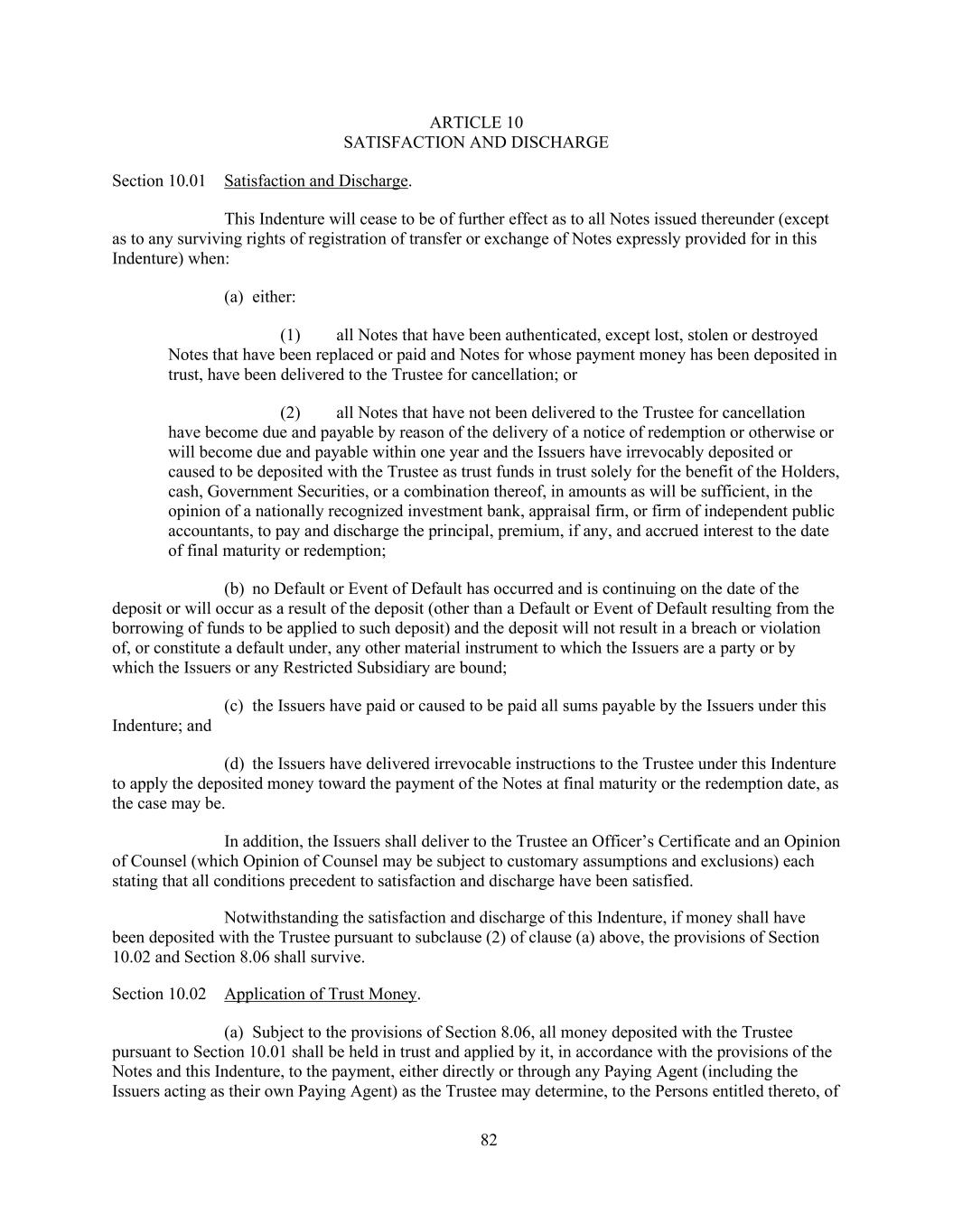 82第十条满足与解除第10.01款满足与解除。在以下情况下,本契约将不再对根据其发行的所有票据(本契约中明确规定的转让或交换票据登记的任何尚存权利除外)具有进一步的效力:(a)任何一种情况:(1)所有已认证的票据,但已被替换或支付的遗失、被盗或销毁的票据以及已以信托方式存入其付款款项的票据除外,已交付受托人注销;或(2)所有未交付受托人注销的票据已因交付赎回通知或其他原因而到期应付或将于一年内到期应付,且发行人已不可撤销地存放或促使仅为持有人利益的信托资金、现金、政府证券或其组合存放于受托人,金额将足够,经国家认可的投资银行、评估公司认为,或独立公共会计师事务所,以支付及解除本金、溢价(如有)及截至最终到期或赎回日期的应计利息;(b)没有发生违约或违约事件,且在存款日期仍在继续,或将因存款而发生(因借入将用于该存款的资金而导致的违约或违约事件除外),且该存款不会导致违约或违反,或构成违约,发行人作为一方或发行人或任何受限制附属公司受约束的任何其他重要文书;(c)发行人已支付或促使支付发行人根据本契约应付的所有款项;及(d)发行人已根据本契约向受托人发出不可撤销的指示,以在最终到期日或赎回日期(视情况而定)将存入的款项用于支付票据。此外,发证人须向受托人交付一份高级人员证明书及一份大律师意见(大律师的意见可能受惯常假设及排除的规限),每一份均须述明满足及解除的所有先决条件已获满足。尽管本指引已获满足及解除,但如款项已依据上文(a)条第(2)款存入受托人,则第10.02条及第8.06条的条文仍然有效。第10.02款信托资金的运用。(a)除第8.06条的条文另有规定外,根据第10.01条存放于受托人的所有款项,须以信托形式持有,并由受托人按照票据及本契约的条文,直接或透过受托人所厘定的任何付款代理人(包括作为其本身付款代理人的发行人),向有权获得该等款项的人申请支付