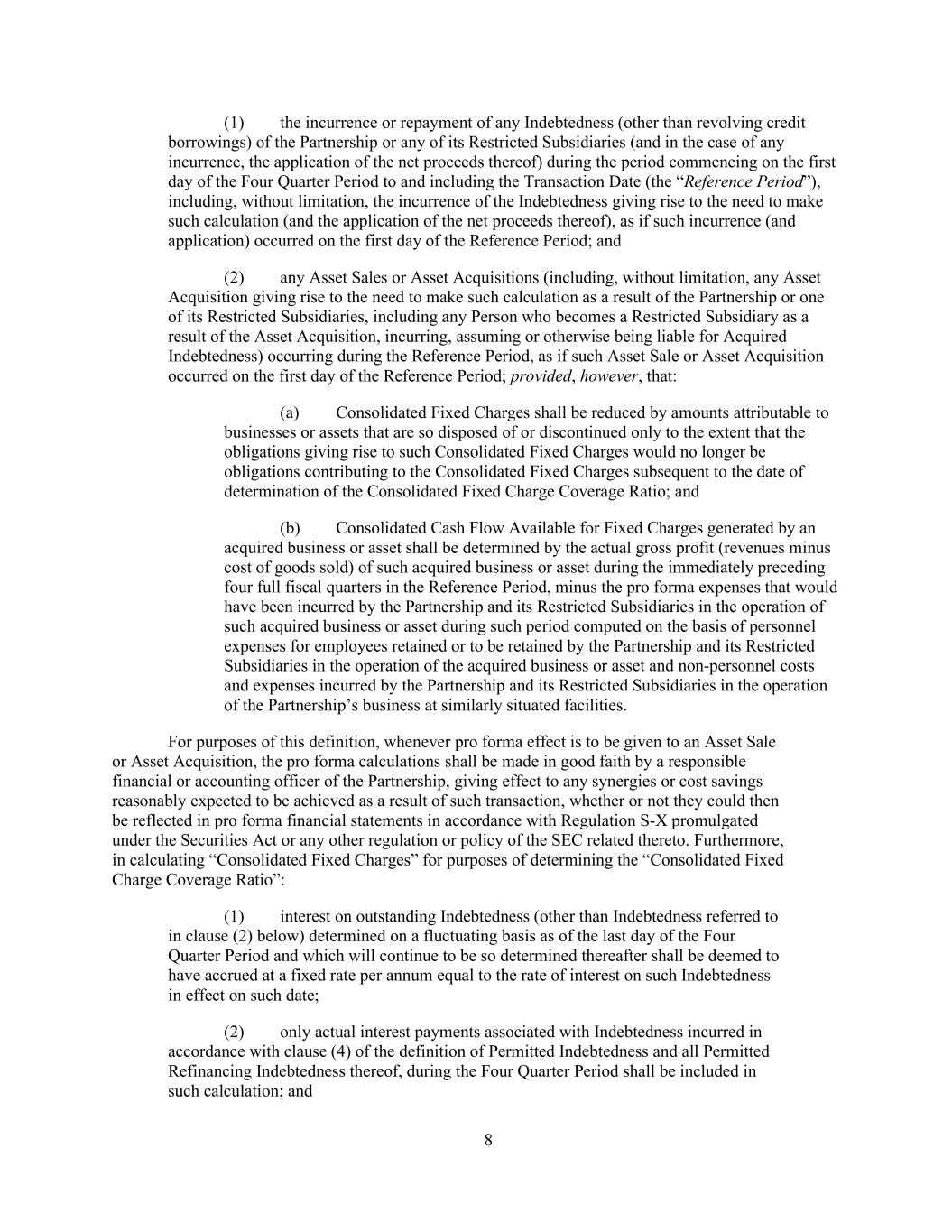 8(1)合伙企业或其任何受限制子公司的任何债务(循环信贷借款除外)的发生或偿还(如发生任何债务,则适用其所得款项净额)在自第四季期间的第一天开始至交易日(包括交易日)的期间内(“参考期”),包括但不限于导致需要进行此类计算的债务的发生(及其所得款项净额的应用),(2)任何资产出售或资产收购(包括但不限于因合伙企业或其受限制附属公司(包括因资产收购而成为受限制附属公司的任何人)而导致需要作出该等计算、产生、承担或以其他方式对所收购债务承担责任的资产出售或资产收购)在该参考期内发生,犹如该资产出售或资产收购发生于该参考期的第一天;但前提是,即:(a)合并固定费用应减去仅在如此处置或终止的范围内归属于业务或资产的金额产生此类合并固定费用的债务将不再是在确定合并固定费用覆盖率之日之后对合并固定费用作出贡献的债务;(b)可用于被收购业务或资产产生的固定费用的合并现金流量应由该被收购业务或资产在该参考期内紧接前四个完整财政季度的实际毛利润(收入减去销售商品成本)确定,减去合伙企业及其受限制子公司在该期间经营该等所收购业务或资产本应发生的备考费用,该费用是根据合伙企业及其受限制子公司在经营所收购业务或资产时保留或将保留的员工的人事费用以及合伙企业及其受限制子公司在类似情况的设施经营合伙企业业务时发生的非人事成本和费用计算的。为本定义的目的,每当要对资产出售或资产收购给予备考效果时,应由合伙企业负责的财务或会计主管本着诚意进行备考计算,从而实现合理预期因此类交易而实现的任何协同效应或成本节约,无论这些协同效应或成本节约随后能否根据《证券法》颁布的条例S-X或美国证券交易委员会与此相关的任何其他条例或政策反映在备考财务报表中。此外,在计算“合并固定费用”以确定“合并固定费用覆盖率”时:(1)截至第四季度期间最后一天按浮动基准确定的未偿债务(下文第(2)款所指债务除外)的利息而其后将继续如此厘定的债务,须当作已按相等于于该日期有效的该等债务的利率的固定年利率累积;(2)只有与根据准许债务定义第(4)条及其所有准许再融资债务所招致的债务有关的实际利息付款,在该四个季度期间内,须计入该等计算;及