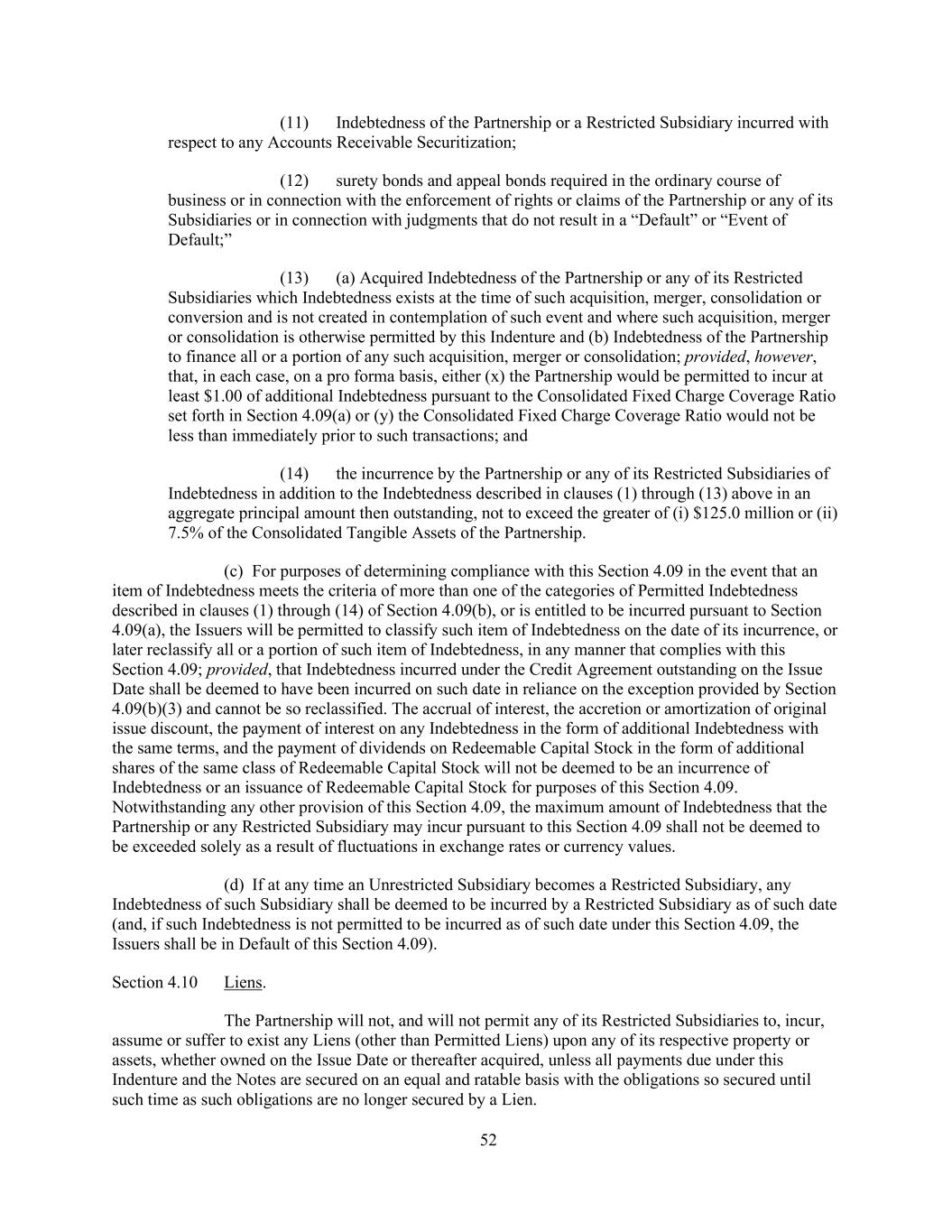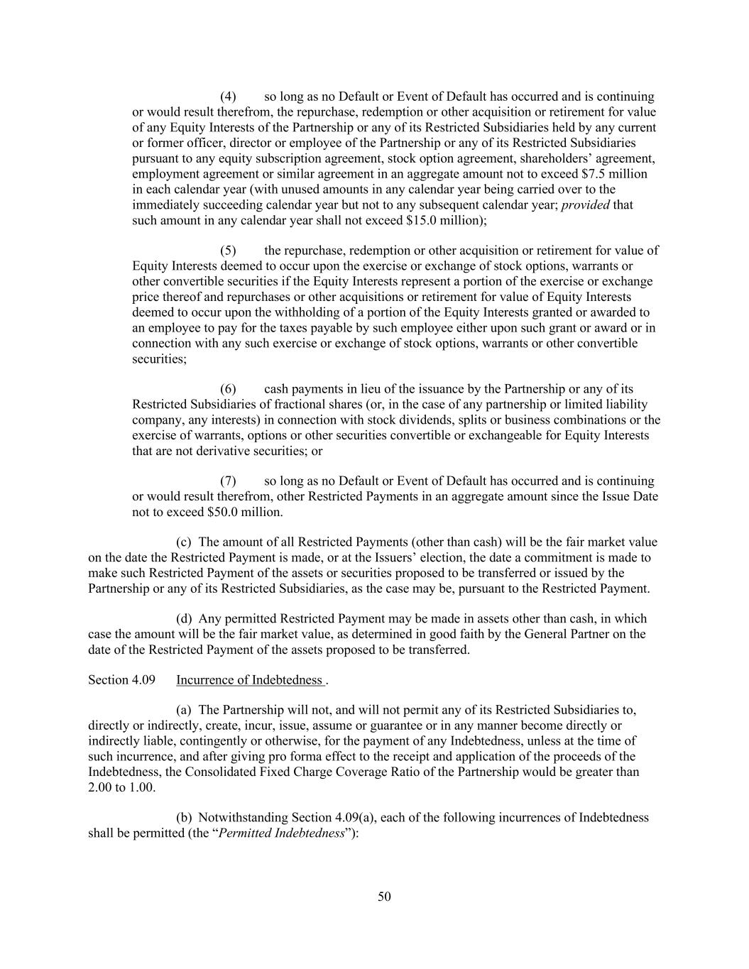 50(4)只要没有发生违约或违约事件,并且仍在继续或将因此而导致,则根据任何股权认购协议、股票期权协议、股东协议,回购、赎回或以其他方式收购或报废合伙企业或其任何受限制子公司的任何股权,由合伙企业或其任何受限制子公司的任何现任或前任高级人员、董事或雇员持有的任何股权或其任何受限制子公司的价值,每个日历年总额不超过750万美元的雇佣协议或类似协议(任何日历年的未使用金额将结转至紧接下一个日历年,但不结转至随后的任何日历年;前提是任何日历年的此种金额不得超过1500万美元);(5)在行使或交换股票期权时被视为发生的股权价值的回购、赎回或其他收购或报废,认股权证或其他可转换证券,如果股权代表其行使或交换价格的一部分,并在扣留授予或授予雇员的部分股权以支付该雇员在授予或授予时或与任何此类行使或交换股票期权有关的应付税款时,以被视为发生的股权价值进行回购或其他收购或报废,认股权证或其他可转换证券;(6)以现金支付代替合伙企业或其任何受限制子公司发行零碎股份(或在任何合伙企业或有限责任公司的情况下,任何权益)与股票股息、拆分或业务合并或行使认股权证、期权或其他可转换或交换为非衍生证券的股权的证券有关;或(7)只要没有发生违约或违约事件,并且仍在继续或将由此导致,自发行日起总额不超过5000万美元的其他限制性付款。(c)所有受限制付款(现金除外)的金额将为作出受限制付款之日的公允市场价值,或根据发行人的选择,即承诺根据受限制付款对合伙企业或其任何受限制子公司(视情况而定)拟转让或发行的资产或证券作出该等受限制付款之日的公允市场价值。(d)任何允许的限制性付款可以现金以外的资产进行,在这种情况下,金额将是由普通合伙人在拟议转让的资产的限制性付款之日善意确定的公平市场价值。第4.09节负债的发生。(a)合伙企业不会、也不会允许其任何受限制的子公司直接或间接设立、招致、发行、承担或担保,或以任何方式直接或间接对任何债务的支付承担或有或以其他方式承担责任,除非在发生此类债务时,并且在对债务收益的接收和应用给予形式上的影响后,合伙企业的合并固定费用覆盖率将大于2.00至1.00。(b)尽管有第4.09(a)条的规定,以下每一项债务的发生均应被允许(“允许的债务”):