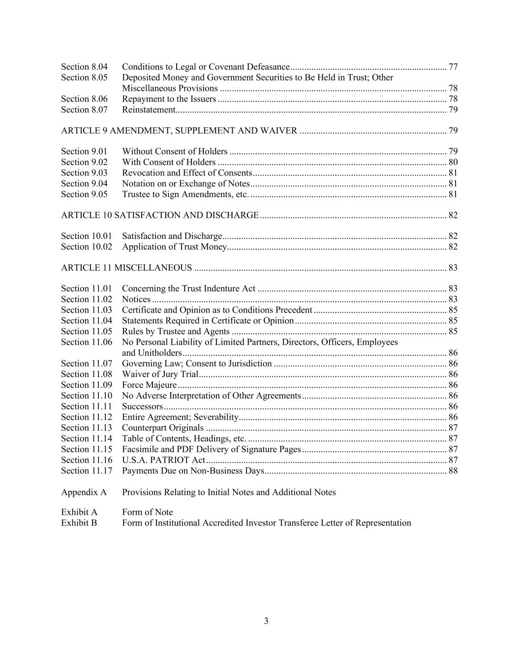 3第8.04节法律或盟约撤销的条件...................................................................77第8.05节存入款项和拟以信托方式持有的政府证券;其他杂项规定......................................................................................................................78第8.06节偿还发行人的款项......................................................................................78第8.07条恢复原状...................................................................................................79条第九条修正、补充和放弃...................................................................................79第9.01条未经持有人同意...................................................................................................79第9.02条经持有人同意....................................................................................................80第9.03条撤销和同意的效力....................................................................81第9.04条票据上的记项或交换....................................................................................81第9.05条受托人签署修正,等....................................................................81第十条满足与解除................................................................................82第10.01条满足与解除................................................82第10.02条信托金的运用.......................................................................................................82第十一条杂项......................................................................................................83第11.01条关于《信托契约法》的通知......................................................................................83第11.02条关于先决条件的证明和意见......................................................................85第11.04条证书或意见中要求的陈述....................................................................................85第11.05条受托人和代理人的规则....................................................................................85第11.06条有限合伙人、董事、高级管理人员的个人责任,雇员和单位持有人.....................................................................................................86第11.07条管辖法律;同意管辖.....................................................................................................86第11.08条放弃陪审团审判.....................................................................................................................86第11.09条不可抗力.....................................................................................86第11.10条对其他协议没有不利解释.....................................................................................86第11.11条继承人.....................................................................................86第11.12条全部协议;可分割性......................................................................86第11.13条对应原件.....................................................................................................87第11.14条目录、标题、等...................................................................................87第11.15节传真和PDF投递签名页......................................................................87第11.16节美国爱国者法.......................................................................................................87第11.17节非营业日到期付款......................................................................88附录A与初始票据和附加票据有关的规定附件一种票据形式的说明丨表附件 B种机构认可投资者受让方代表函形式