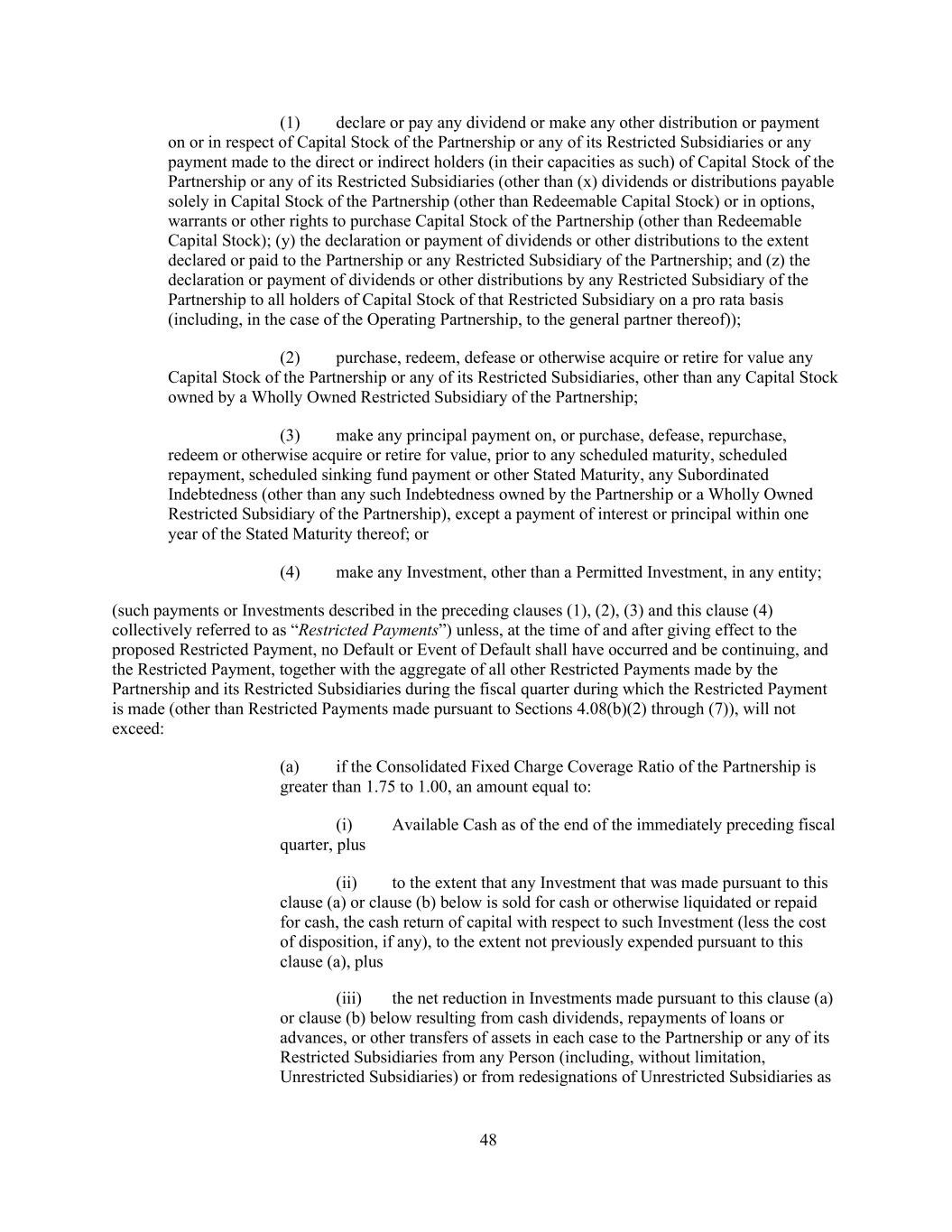 48(1)宣布或支付任何股息或就合伙企业或其任何受限制附属公司的股本作出任何其他分配或付款,或向合伙企业或其任何受限制附属公司的股本的直接或间接持有人(以其身份)作出的任何付款(不包括(x)仅以合伙企业股本(可赎回股本)或期权支付的股息或分派,认股权证或其他购买合伙企业股本的权利(可赎回股本除外);(y)在向合伙企业或合伙企业的任何受限制子公司宣派或支付的范围内宣派或支付股息或其他分配;(z)合伙企业的任何受限制子公司按比例向该受限制子公司的所有股本持有人宣派或支付股息或其他分配(就经营合伙而言,包括向其普通合伙人);(2)购买、赎回,(3)在任何预定到期、预定还款、预定偿债基金付款或其他规定到期之前,对合伙企业或其任何受限制子公司的任何股本(合伙企业的全资受限制子公司拥有的任何股本除外)进行任何本金支付,或购买、取消、回购、赎回或以其他方式取得或退出以获得价值,任何次级债务(合伙企业或合伙企业的全资受限制子公司拥有的任何此类债务除外),除非在所述的到期日一年内支付利息或本金;或(4)对任何实体进行许可投资以外的任何投资;(前述第(1)、(2)、(3)条和本第(4)条中所述的付款或投资统称为“限制性付款”),除非在提议的限制性付款生效时和之后,没有发生违约或违约事件,并且限制性付款仍在继续,连同合伙企业及其受限制子公司在进行受限制付款的财政季度进行的所有其他受限制付款的总和(根据第4.08(b)(2)至(7)条进行的受限制付款除外),将不超过:(a)如果合伙企业的合并固定费用覆盖率大于1.75至1.00,金额等于:(i)截至上一个财政季度末的可用现金,加上(ii)如根据下文(a)或(b)条作出的任何投资以现金出售或以其他方式清算或以现金偿还,则与该投资有关的资本现金回报(减去处置成本,如有的话),但以先前未根据本(a)条支出为限,加上(iii)根据本(a)条或下文(b)条作出的投资因现金股息、偿还贷款或垫款而产生的净减少额,或在每一情况下从任何人(包括但不限于非受限子公司)或从重新指定非受限子公司作为
