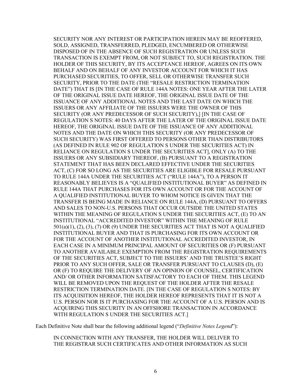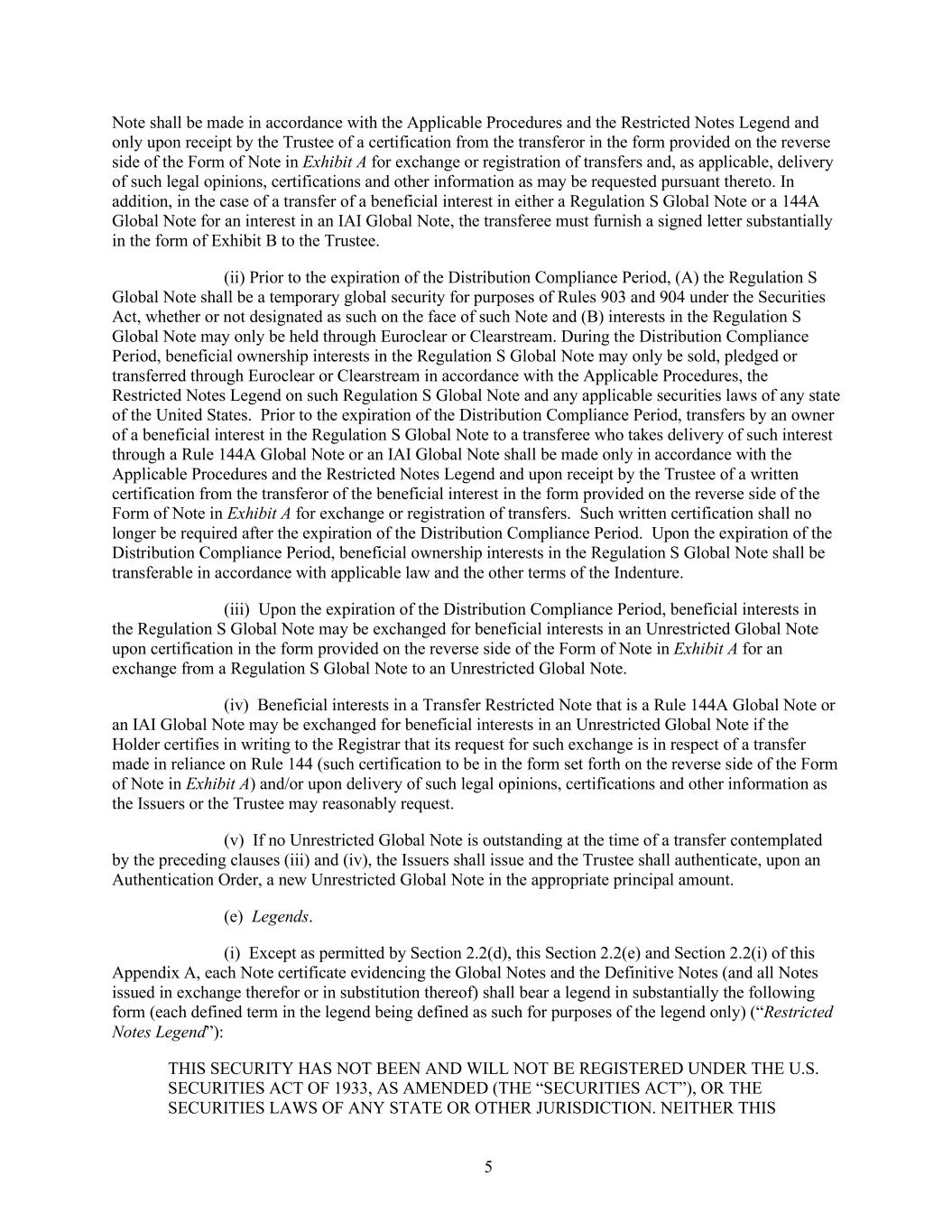 5应根据适用程序和限制性票据图例并仅在受托人收到转让人提供的用于交换或登记转让并(如适用)交付据此可能要求的法律意见、证明和其他信息的、在附件 A票据表格反面提供的表格的证明后,方可作出附注。此外,在将S条例全球票据的实益权益或144A全球票据的实益权益转让以换取IAI全球票据的权益的情况下,受让方必须向受托人提供一份大体上以附件 B形式签署的信函。(ii)在分销合规期届满前,(a)就《证券法》第903条和第904条而言,条例S全球票据应为临时全球证券,无论该票据是否在票面上被指定为此类证券,以及(b)条例S全球票据中的权益只能通过Euroclear或Clearstream持有。在分配合规期内,条例S Global Note中的受益所有权权益只能根据适用程序、该条例S Global Note上的限制性票据图例以及美国任何州的任何适用证券法通过Euroclear或Clearstream出售、质押或转让。在分配合规期届满之前,S条例全球票据的实益权益所有人向通过第144A条全球票据或IAI全球票据收取该等权益的受让人进行的转让,仅应根据适用程序和限制性票据图例并在受托人收到转让人就该实益权益出具的用于交换或登记转让的丨证物A表格反面提供的表格的书面证明后,方可进行。分销合规期届满后,不再要求提供此类书面证明。在分配合规期届满时,S条例全球票据中的受益所有权权益应可根据适用法律和义齿的其他条款进行转让。(iii)于分销合规期届满时,条例S全球票据中的实益权益可在以附件 A中票据表格反面提供的格式进行认证后,以换取无限制全球票据中的实益权益,以换取从条例S全球票据到无限制全球票据的交换。(iv)属于规则144A全球票据或IAI全球票据的转让受限制票据的实益权益可以交换为无限制全球票据的实益权益,前提是持有人以书面向书记官长证明其进行此类交换的请求是关于依据规则144进行的转让(该证明的格式应为附件 A中票据表格反面所列的格式)和/或在交付发行人或受托人可能合理要求的此类法律意见、证明和其他信息时。(v)如果在上述第(iii)和(iv)条所设想的转让时没有未偿付的非限制性全球票据,则发行人应根据认证令发行和受托人认证新的本金金额适当的非限制性全球票据。(e)传说。(i)除本附录A第2.2(d)条、本第2.2(e)条和第2.2(i)条允许的情况外,证明全球票据和最终票据(以及作为交换或替代票据而发行的所有票据)的每份票据证书应带有大致如下形式的图例(图例中的每个定义术语仅为图例的目的而定义为这样)(“限制性票据图例”):该证券没有也不会根据经修订的1933年美国证券法(“证券法”)或任何国家或其他司法管辖区的证券法进行登记。这都不是
