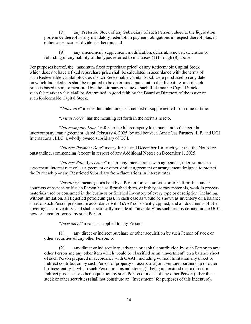 14(8)上述人士的任何附属公司的任何优先股,按其清算优先权估值或就该附属公司的任何强制赎回付款义务,加上(在任何一种情况下)其应计股息;及(9)上述第(1)至(8)条所提述类型的任何负债的任何修订、补充、修改、延期、续期、延期或退还。就本协议而言,任何没有固定回购价格的可赎回股本的“最高固定回购价格”,应按照该可赎回股本的条款计算,如同该可赎回股本是在要求根据本契约确定债务的任何日期购买的,如果该价格基于或以该可赎回股本的公允市场价值计量,该公平市场价值应由该可赎回股本发行人的董事会善意确定。“义齿”是指本义齿,经不时修订或补充。“Initial Notes”具有在本协议的独奏会中阐述的含义。“公司间贷款”指AmeriGas Partners,L.P.与UGI的全资附属公司UGI International,LLC(日期为2025年2月4日)根据该特定公司间贷款协议提供的公司间贷款。「利息支付日」指未偿还票据的每年6月1日及12月1日,由2025年12月1日开始(任何额外票据除外)。“利率协议”是指旨在保护合伙企业或任何受限制子公司免受利率波动影响的任何利率互换协议、利率上限协议、利率项圈协议或其他类似协议或安排。“库存”是指某人持有的用于出售或租赁或根据服务合同提供的货物,或者如果该人已如此提供,或者如果它们是原材料、在业务中使用或消耗的过程材料或每一类型或每一种类型的成品库存(包括但不限于所有液化石油气),在每一种情况下,将在该人根据一贯适用的公认会计原则编制的资产负债表上显示为库存;以及涵盖此类库存的所有所有权文件,并且应具体包括UCC中定义的所有“库存”,这些术语现在或将来归这些人所有。“投资”是指,适用于任何人:(1)该人直接或间接购买或以其他方式收购任何其他人的股票或其他证券;或(2)该人向任何其他人提供的任何直接或间接贷款、垫款或出资,以及根据公认会计原则编制的该人资产负债表上将被归类为“投资”的任何其他项目,包括但不限于该人对合资企业的财产或资产的任何直接或间接贡献,该人保留权益的合伙企业或其他商业实体(有一项理解,即该人直接或间接购买或以其他方式获得任何其他人的资产(股票或其他证券除外)不应构成本契约所指的“投资”)。