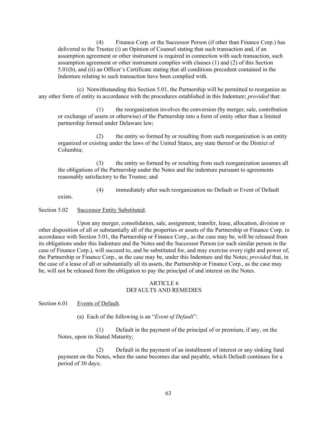 63(4)Finance Corp.或继任人(如不是Finance Corp.)已向受托人交付(i)大律师意见,述明该等交易,如与该等交易有关须订立假设协议或其他文书,则该等假设协议或其他文书符合本条第5.01(b)条第(1)及(2)款,及(ii)高级人员证明书,述明与该等交易有关的指引所载的所有先决条件均已获遵从。(c)尽管有本条第5.01款的规定,合伙企业仍将被允许按照本指南确立的程序作为任何其他形式的实体进行重组;但前提是:(1)重组涉及将合伙企业(通过合并、出售、出资或交换资产或其他方式)转换为根据特拉华州法律组建的有限合伙企业以外的实体形式;(2)由此类重组组建或由此产生的实体是根据美国法律组建或存在的实体,其任何州或哥伦比亚特区;(3)由此类重组组建或由此产生的实体根据受托人合理满意的协议承担合伙企业在票据和契约下的所有义务;(4)紧接此类重组后不存在违约或违约事件。第5.02节继任实体被取代。在根据第5.01条对合伙企业或财务公司的全部或几乎全部财产或资产进行任何合并、合并、出售、转让、转让、租赁、分配、分割或其他处置时,合伙企业或财务公司(视情况而定)将免除其在本契约和票据下的义务,而继承人(或财务公司情况下的类似人)将继承、取代、并可行使合伙企业或财务公司(视情况而定)的所有权利和权力,根据本契约和票据;条件是,在租赁其全部或几乎全部资产的情况下,合伙企业或财务公司(视情况而定)将不会免除支付票据本金和利息的义务。第六条违约和补救措施第6.01款违约事件。(a)以下每一项均为“违约事件”:(1)票据的本金或溢价(如有的话)在其规定的到期日发生违约;(2)票据的分期利息或任何偿债基金付款在到期应付时发生违约,该违约持续30天;