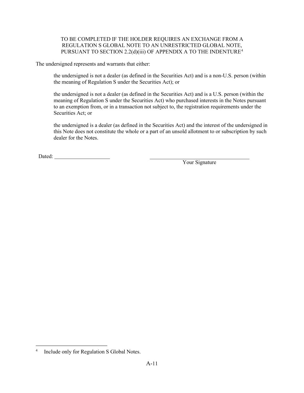 如果持有人要求从条例的全球票据交换为无限制的全球票据,则完成A-11,根据契约A附录A第2.2(d)(iii)节4,以下签署人声明并保证:以下签署人不是交易商(定义见《证券法》),而是非美国人(在《证券法》条例S的含义内);或以下签署人不是交易商(定义见《证券法》),而是根据豁免购买票据权益的美国人(在《证券法》条例S的含义内),或在不受,《证券法》规定的注册要求;或以下签署人是交易商(定义见《证券法》),且以下签署人在本票据中的权益并不构成该交易商未售出的配售或认购票据的全部或部分。Dated:Your Signature 4 Include only for Regulation S Global Notes。